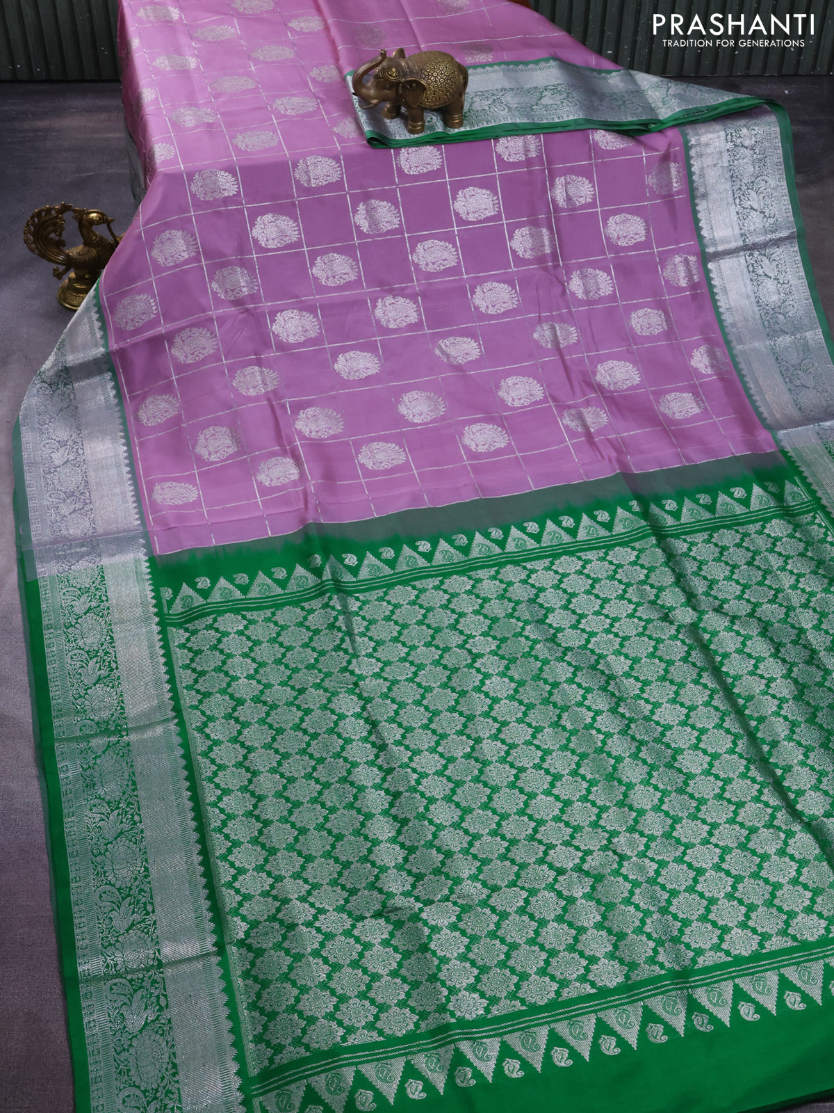 Venkatagiri silk saree pastel lavender and green with silver zari checks & buttas and silver zari woven border