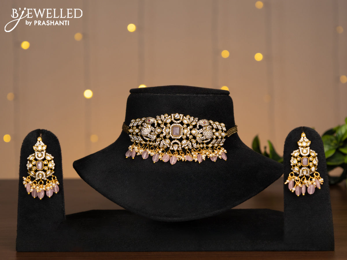 Victorian finish choker elephant design with baby pink & cz stones and beads hanging