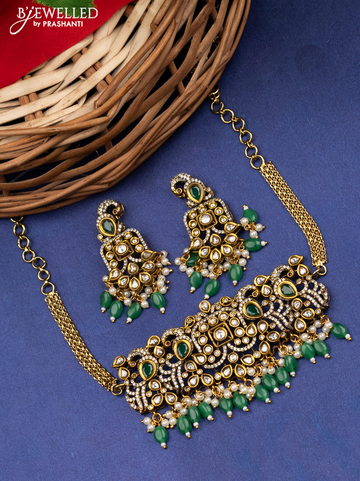 Victorian finish choker peacock design with kemp & cz stones and green beads hanging