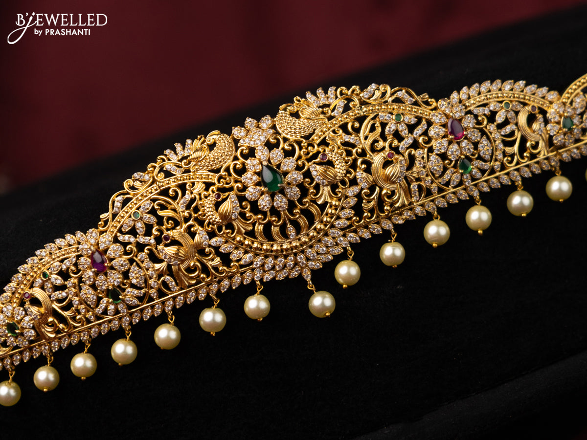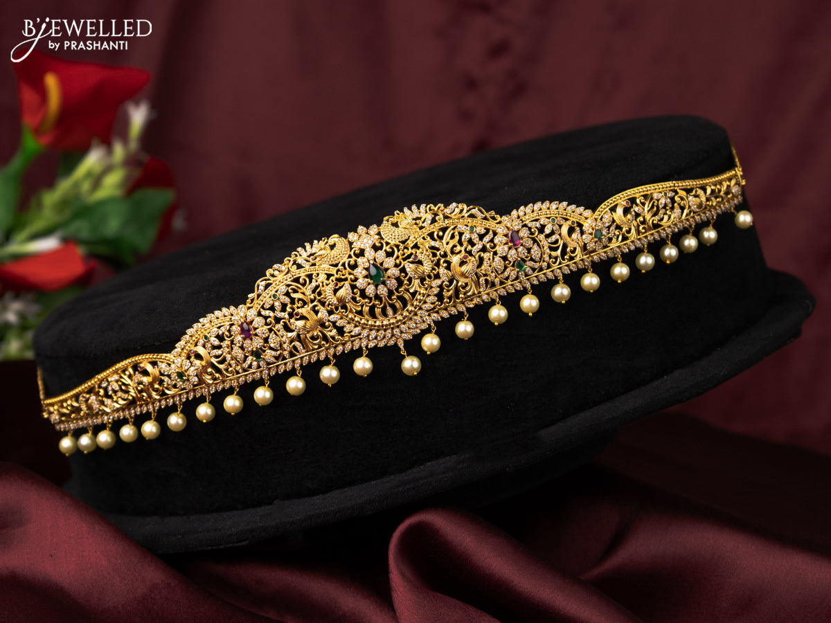 Zircon hip chain peacock design with kemp & cz stones and pearl hangings in gold finish