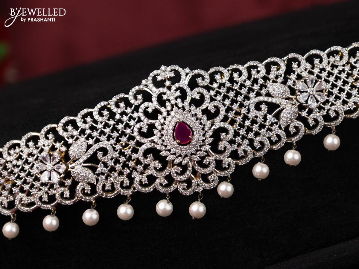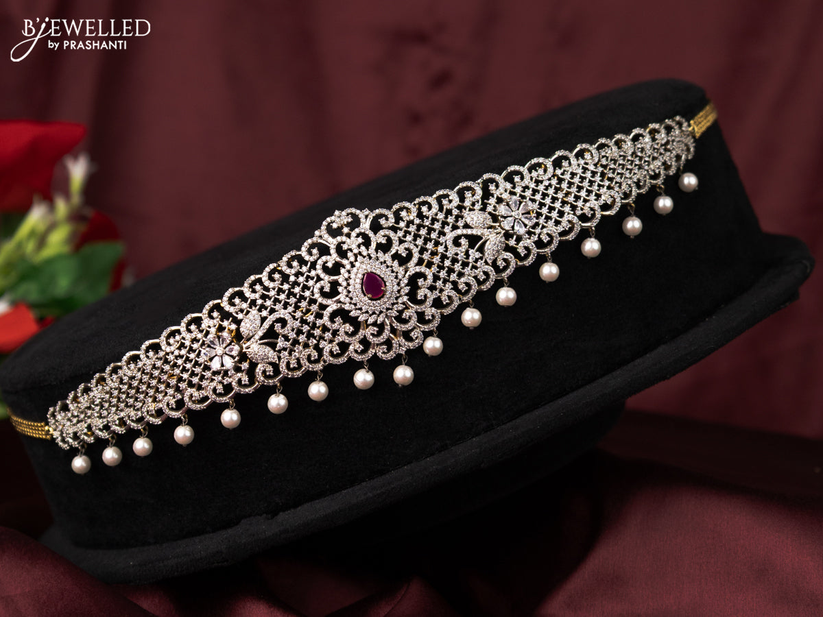 Zircon hip chain with ruby & cz stones and pearl hangings in gold finish