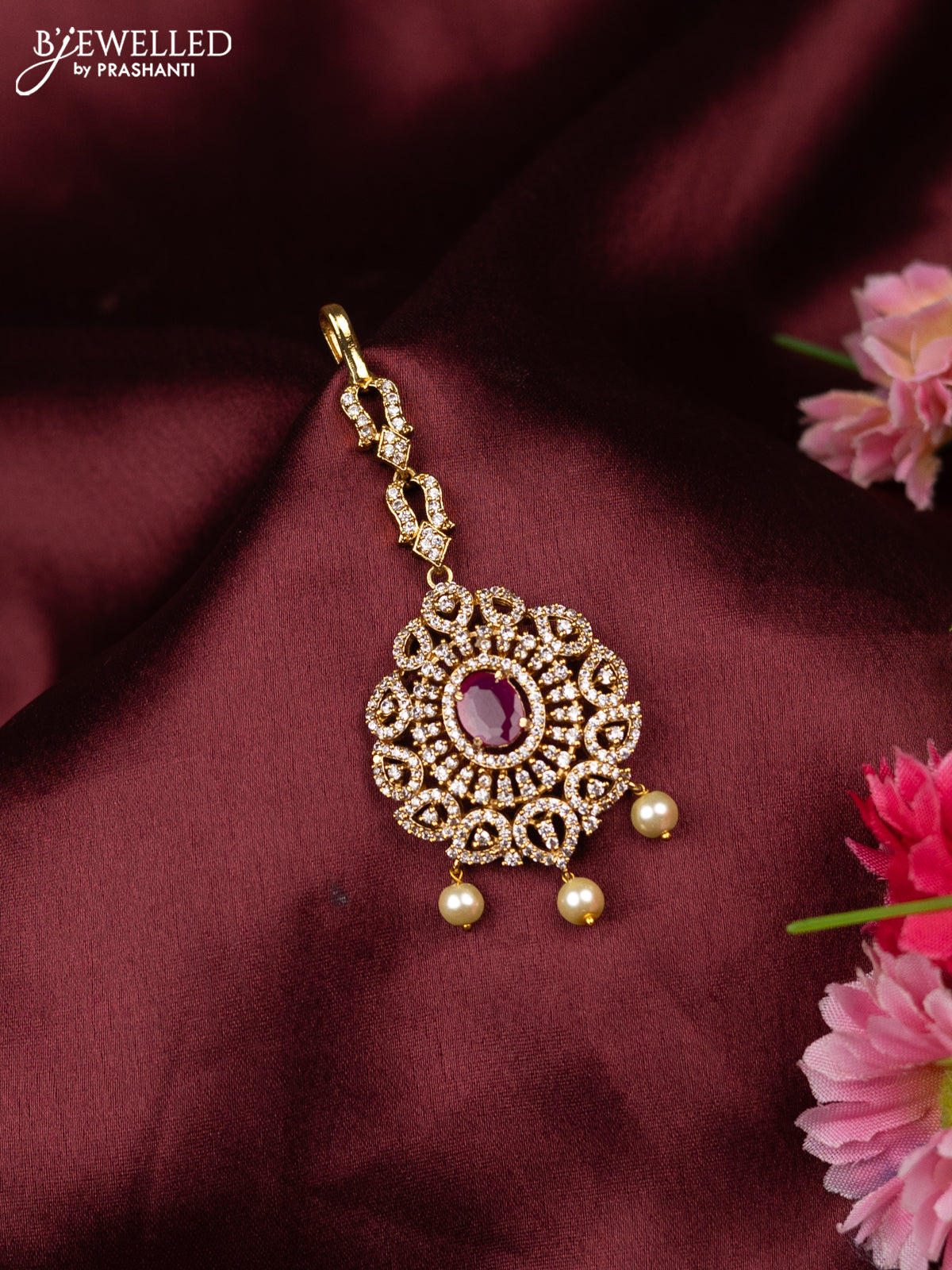 Zircon maang tikka with ruby & cz stones and pearl hangings