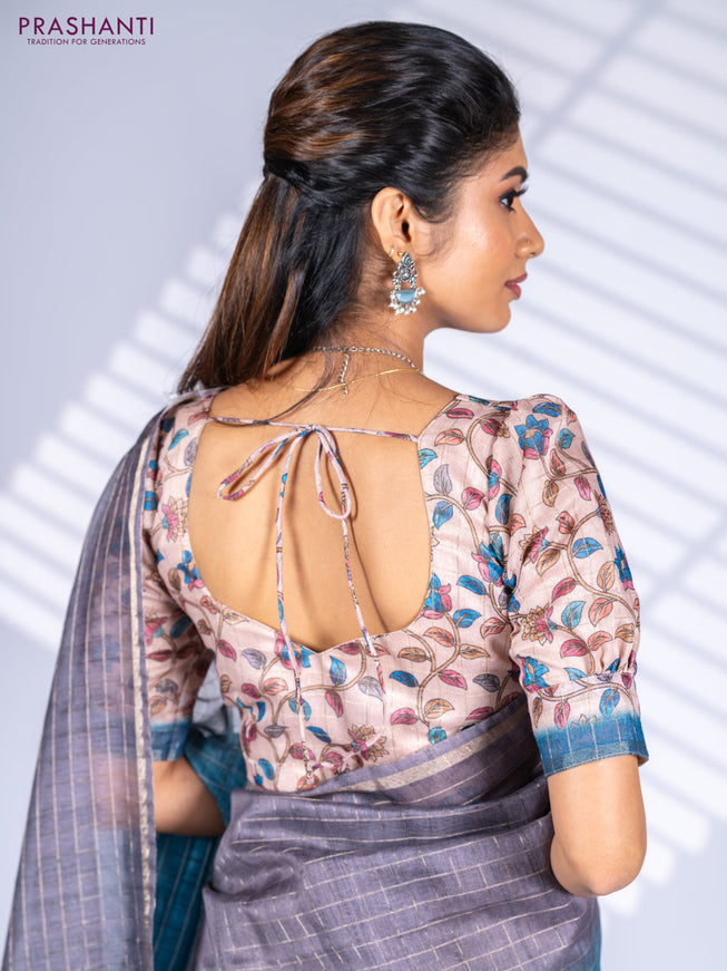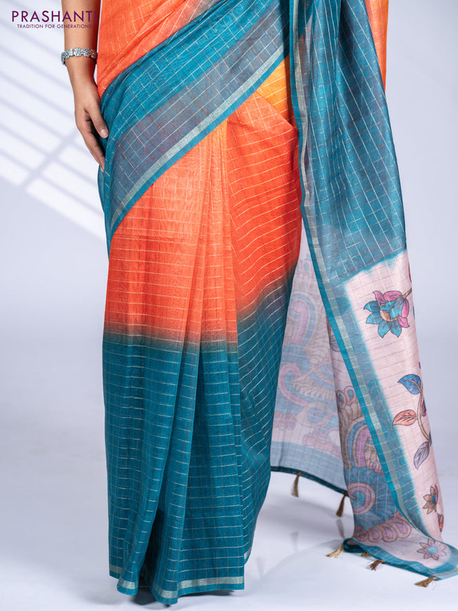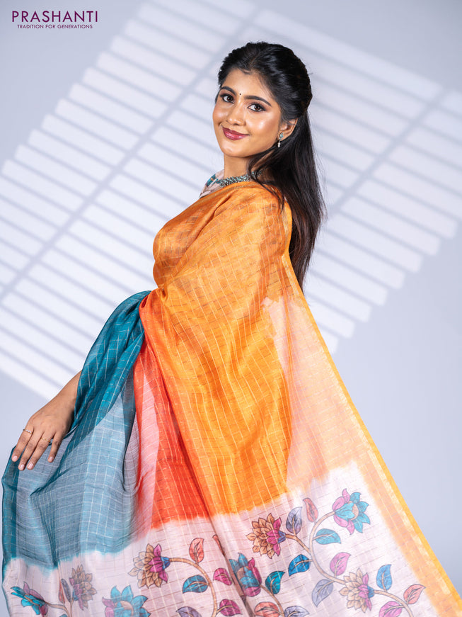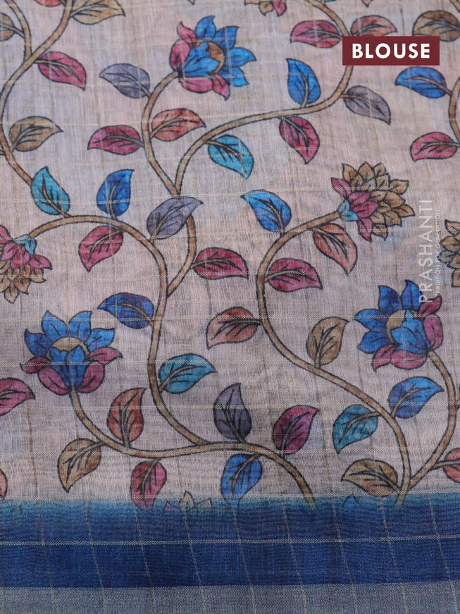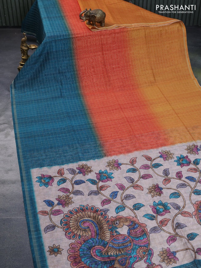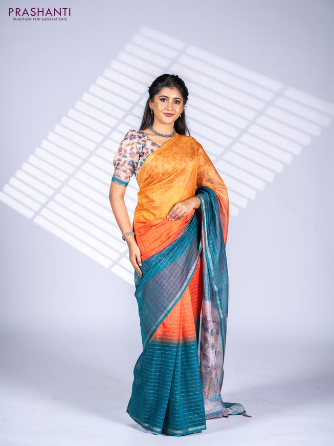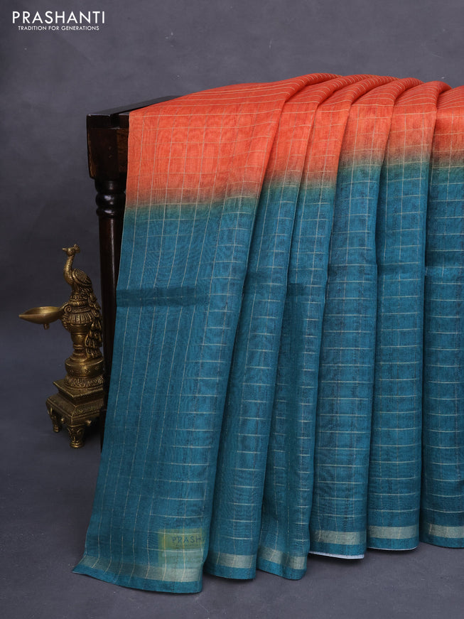 Semi chanderi saree beige and peacock blue with...