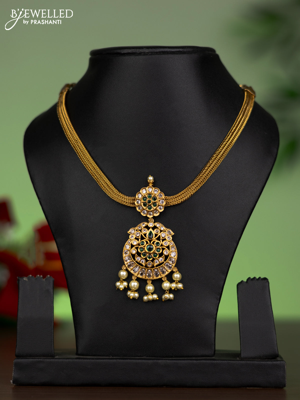 Antique attigai necklace chandbali design with emerald & cz stone and pearl hanging without earring