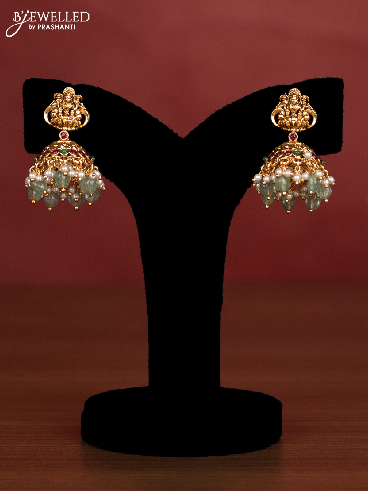 Antique beaded haaram lakshmi pendant with kemp stones and pearl & green beads hanging