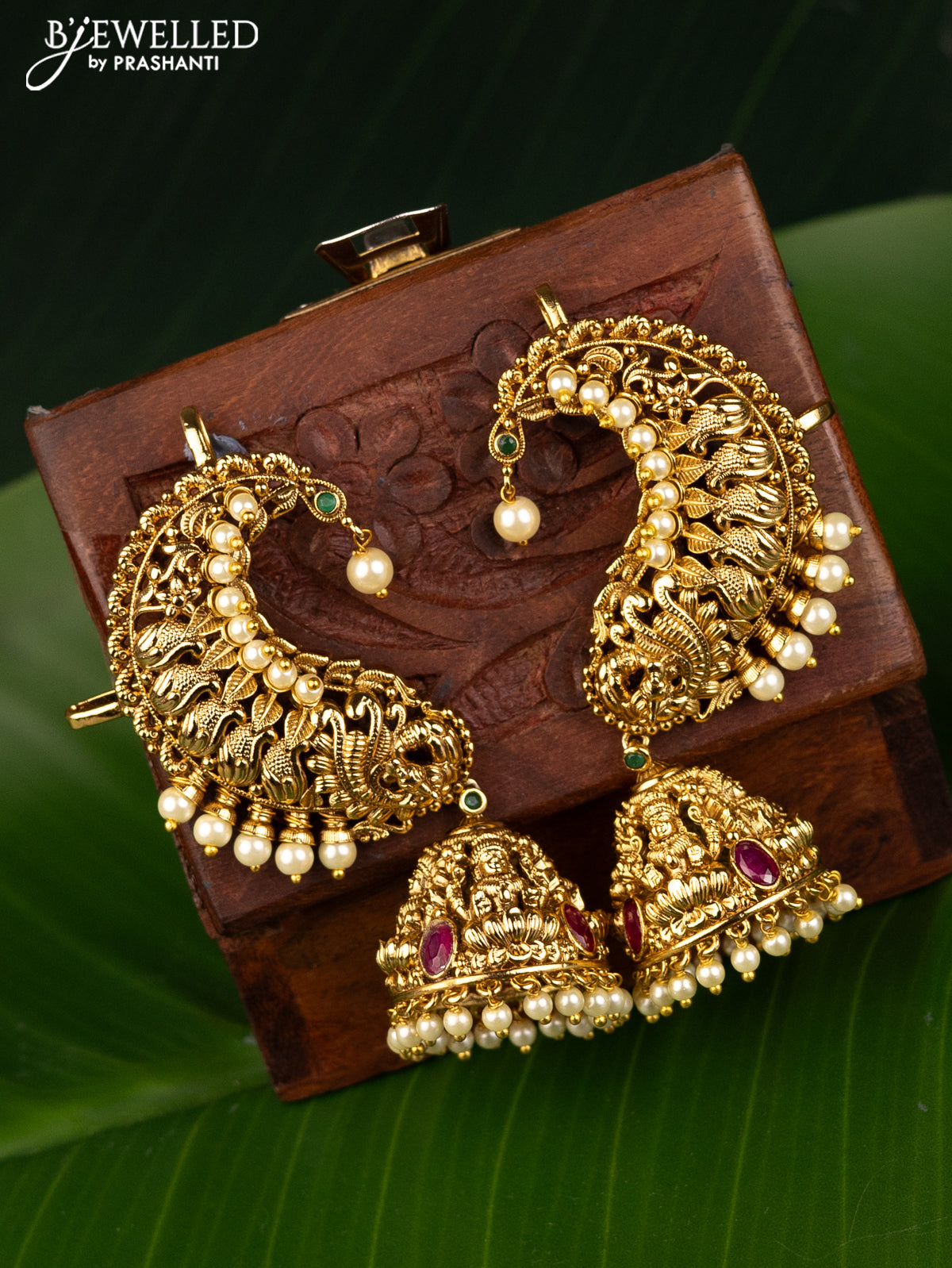 Antique earcuff jhumka lakshmi design with kemp stones and pearl hangings