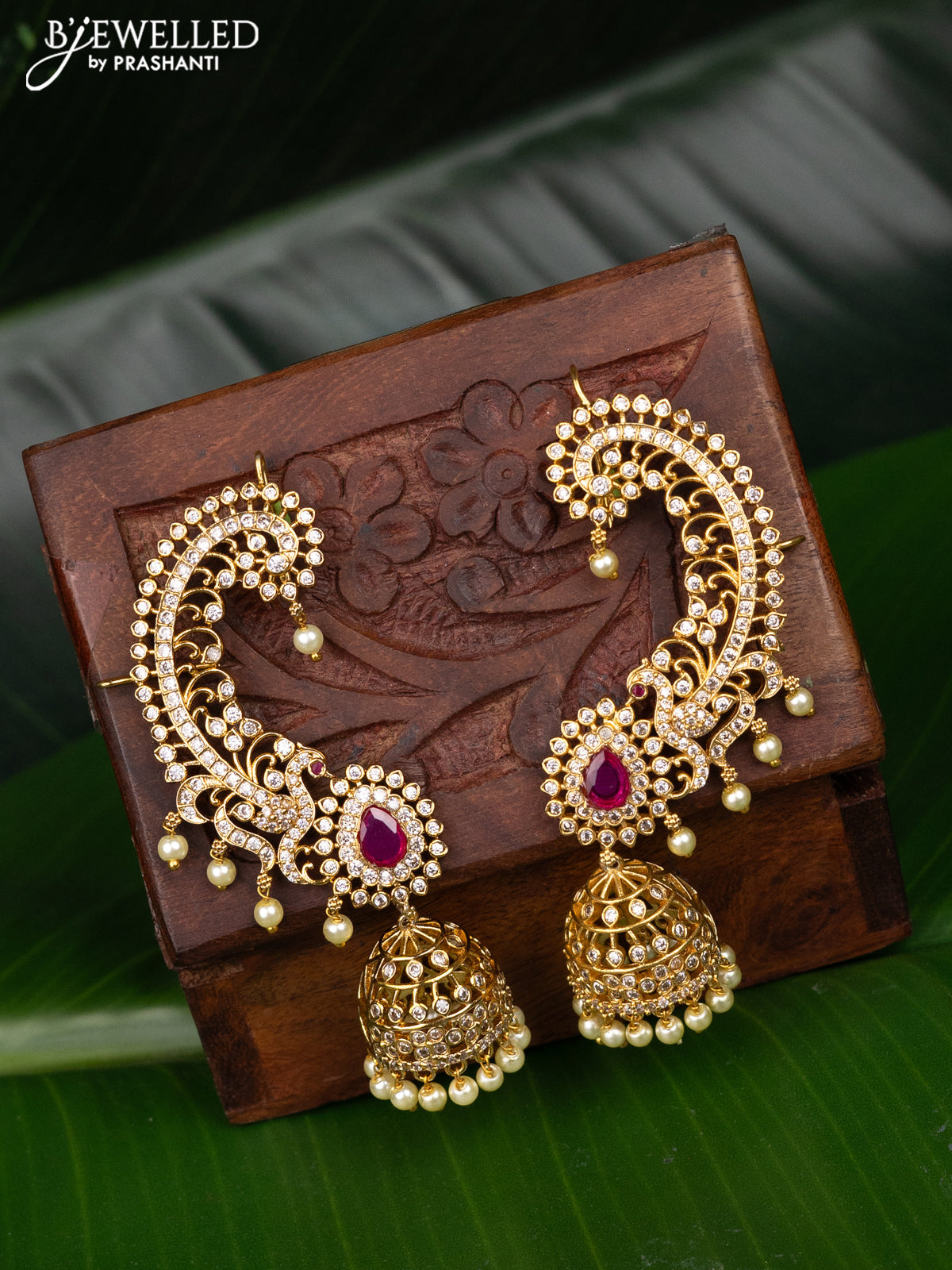 Antique earcuff jhumka with pink kemp & cz stones and pearl hangings
