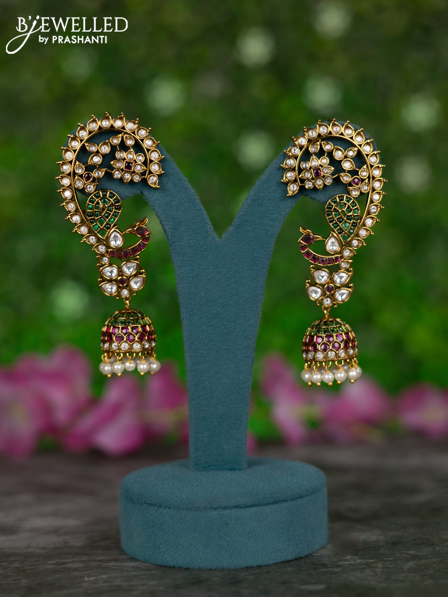Antique earcuff jhumkas peacock design with kemp & kundan stones and pearl hangings