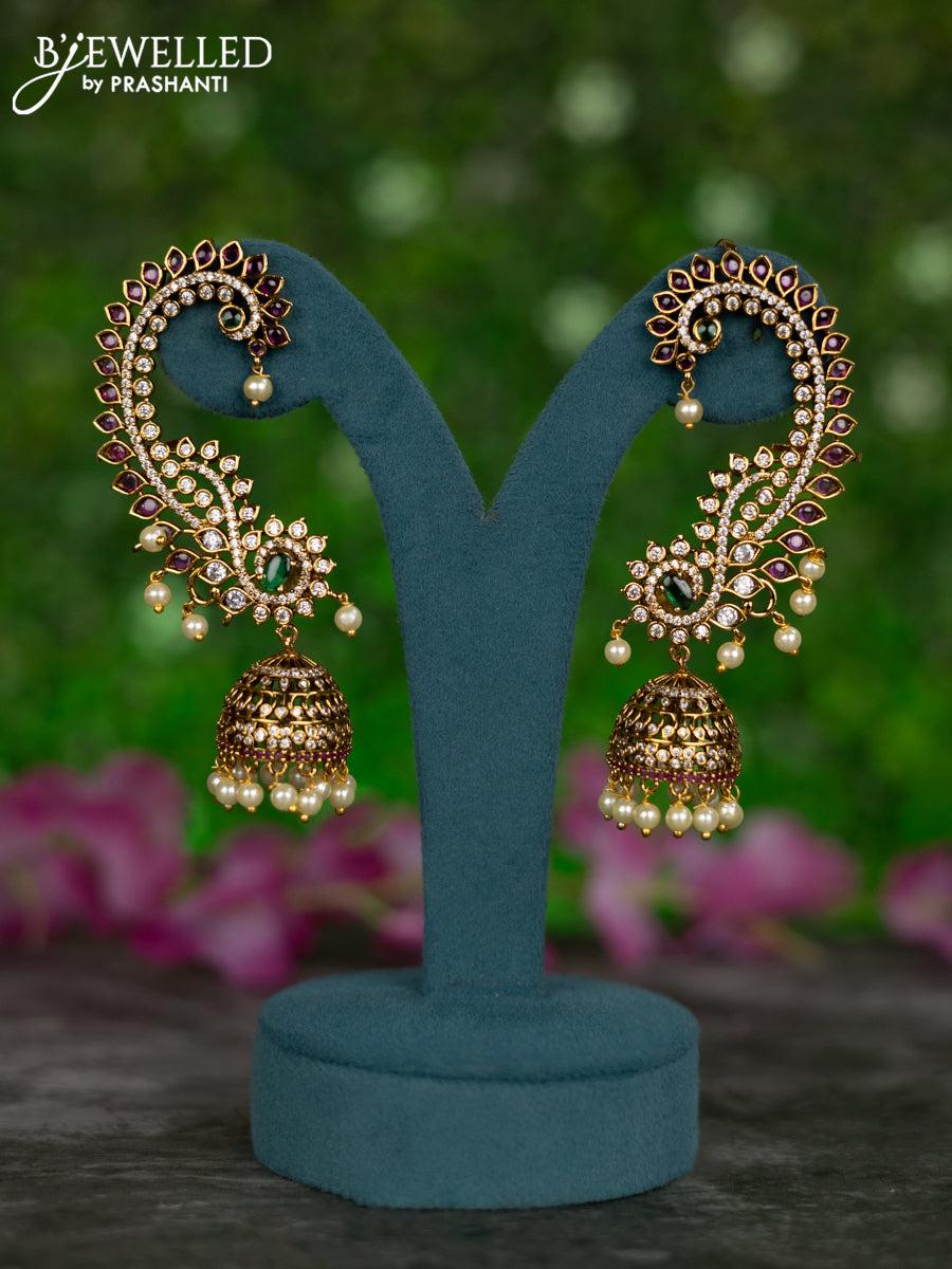 Antique earcuff jhumkas with kemp & cz stones and pearl hangings