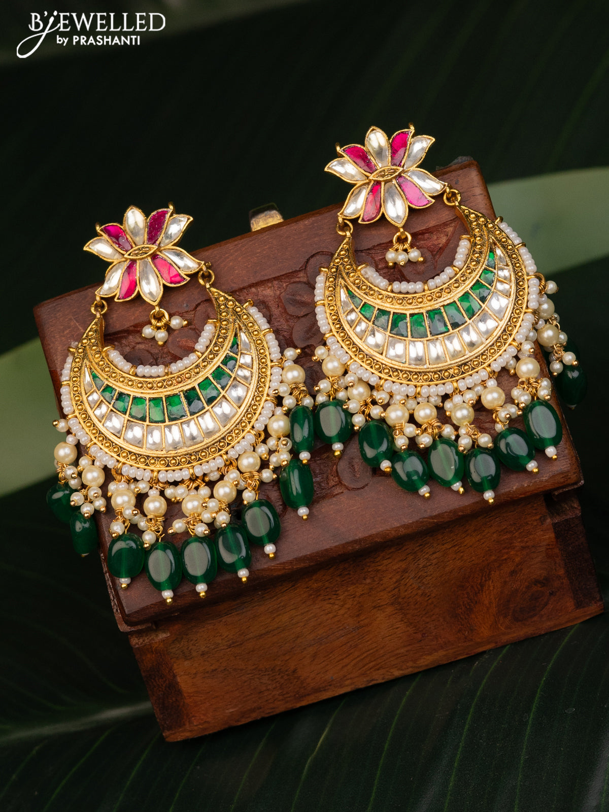 Antique earrings chandbali & lotus design with kemp pachi kundan stones and pearl & green beads hanging