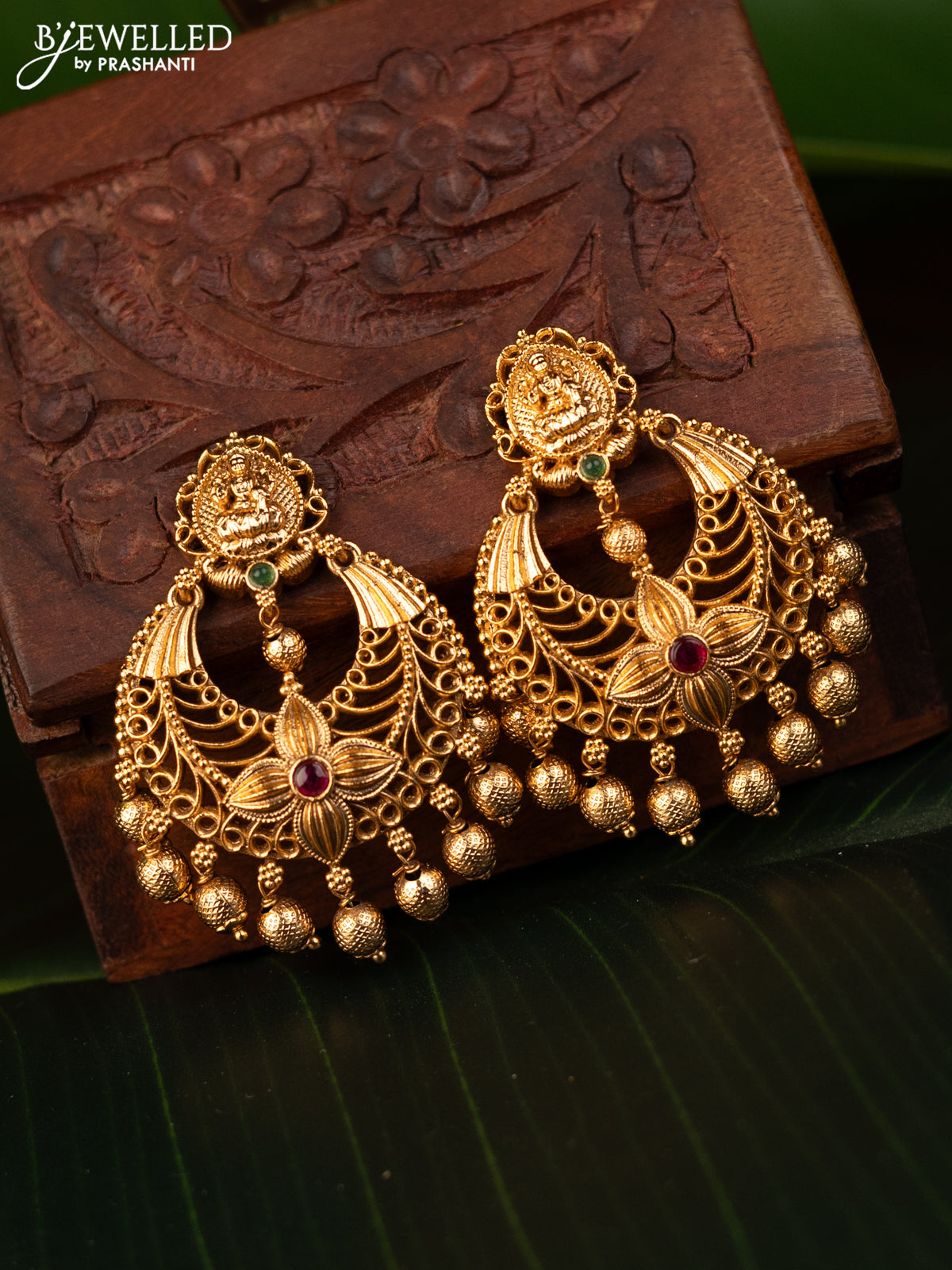 Antique earrings lakshmi design with kemp stones and golden beads hanging