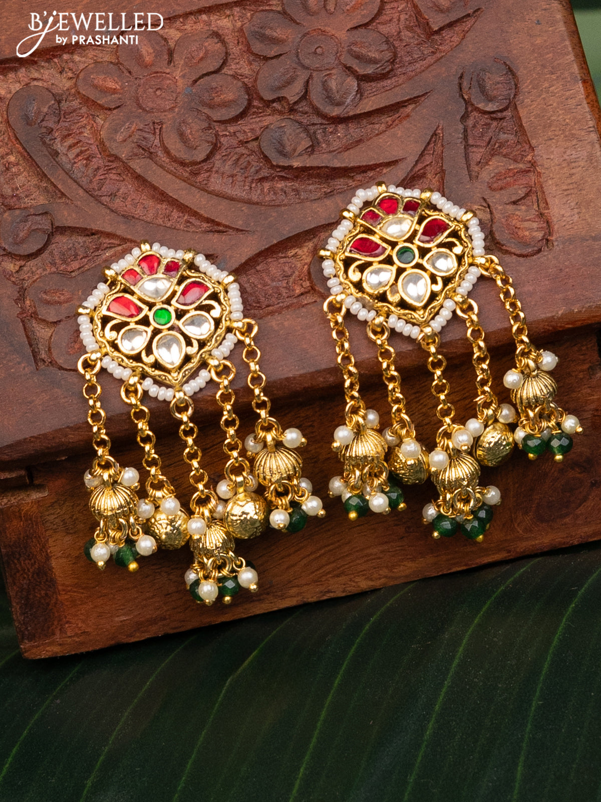 Antique earrings with kemp pachi kundan stones and pearl & green beads hanging