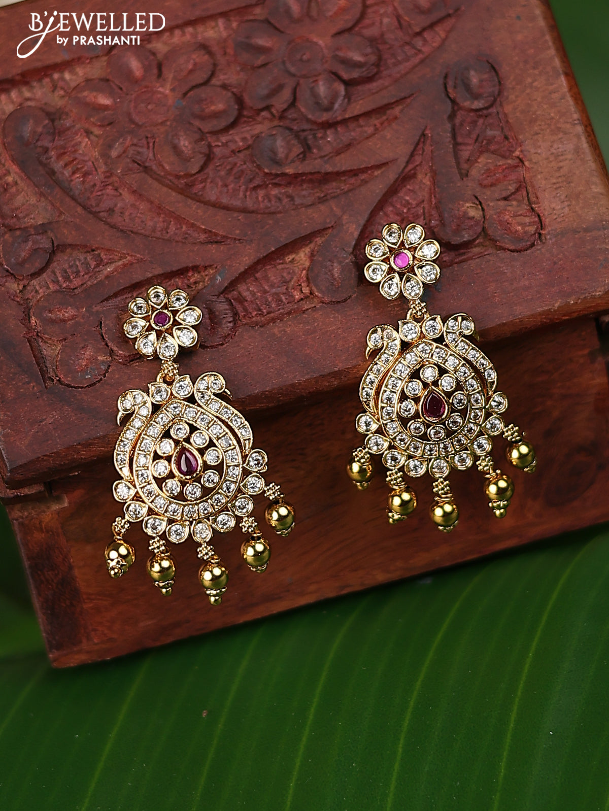 Antique earrings with pink kemp & cz stons and golden beads hanging