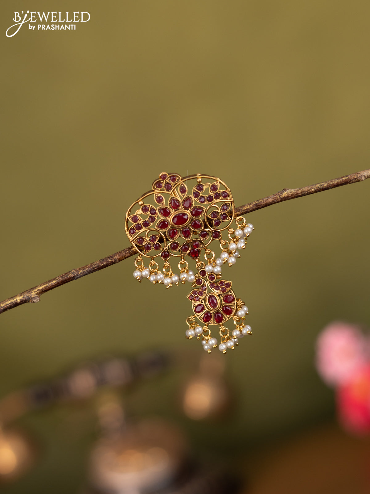 Antique jada billai peacock design with pink kemp stones and pearl hangings