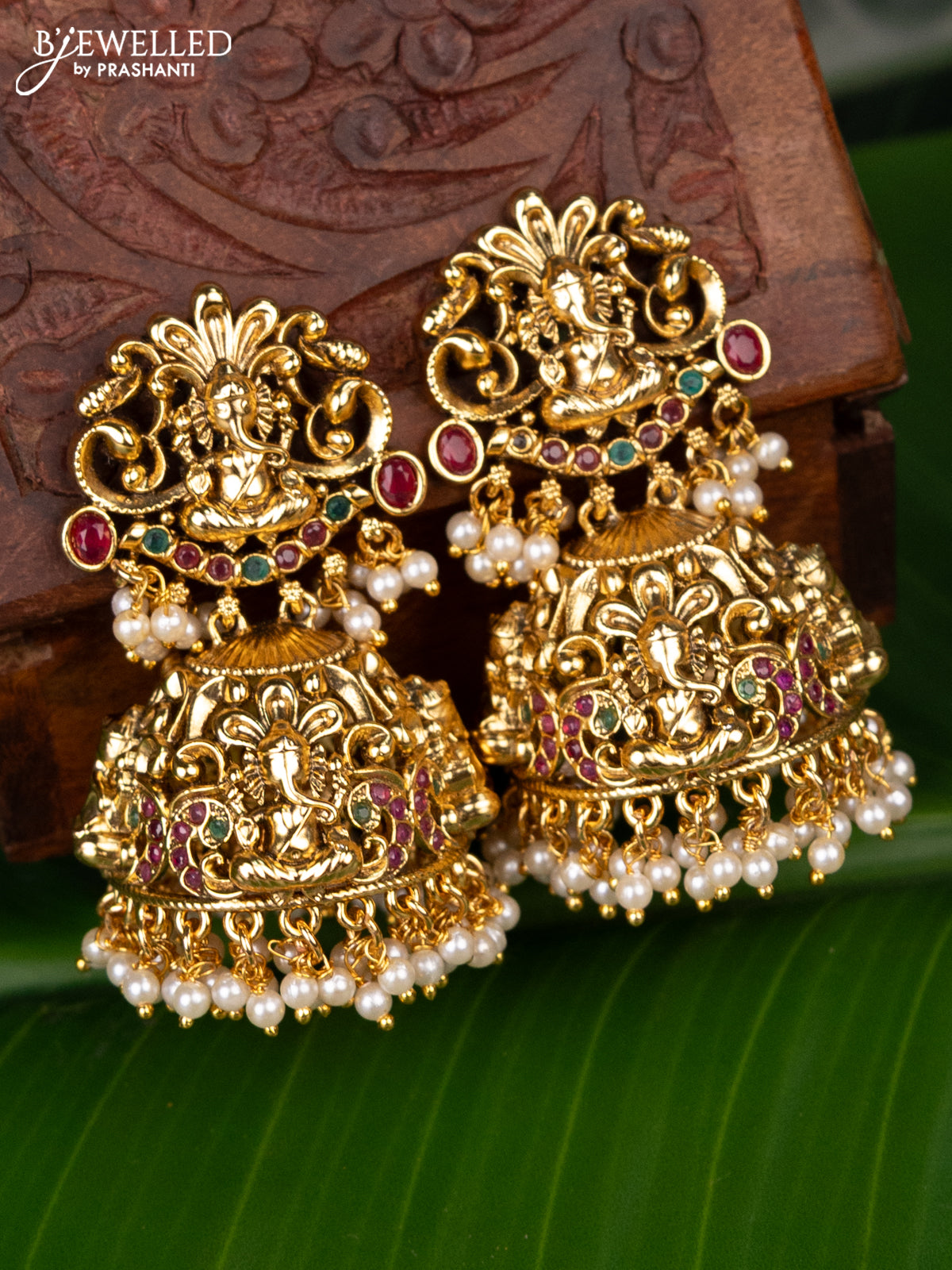 Antique jhumka ganesha design with kemp stones and pearl hanging