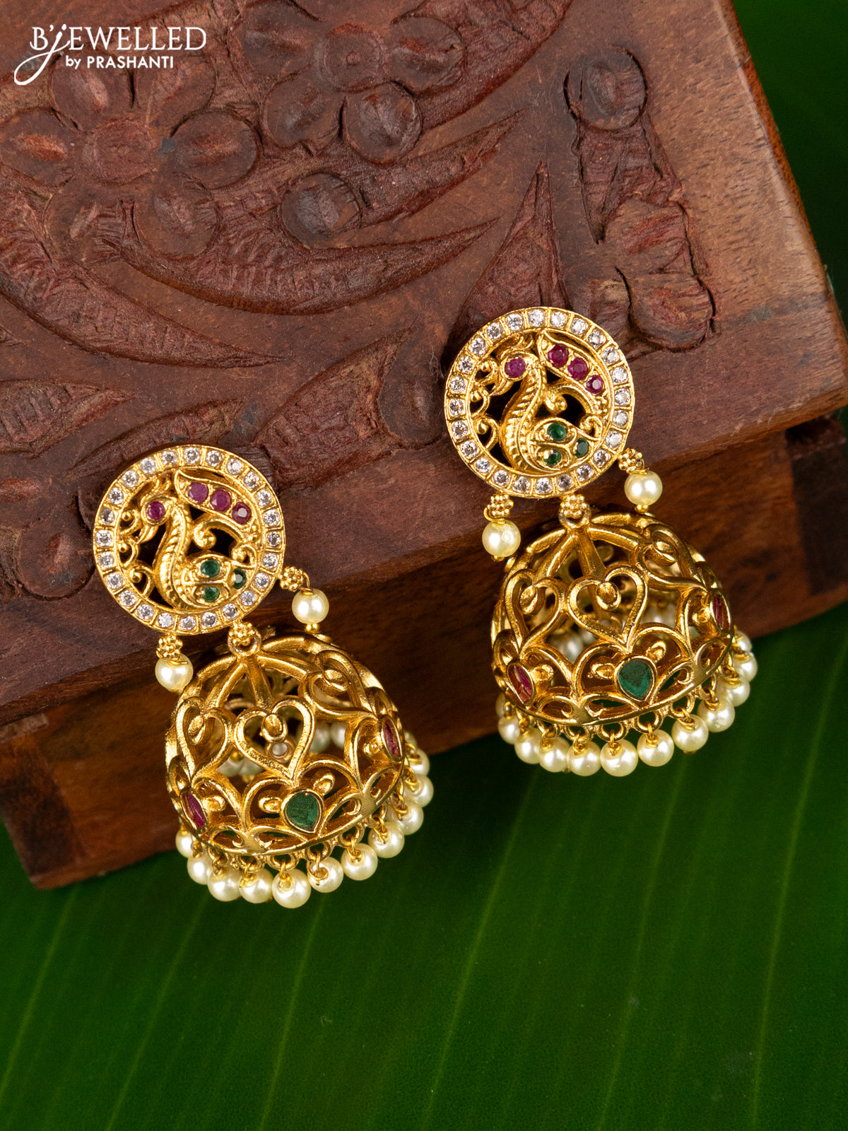 Antique jhumka peacock design with kemp & cz stones and pearl hangings