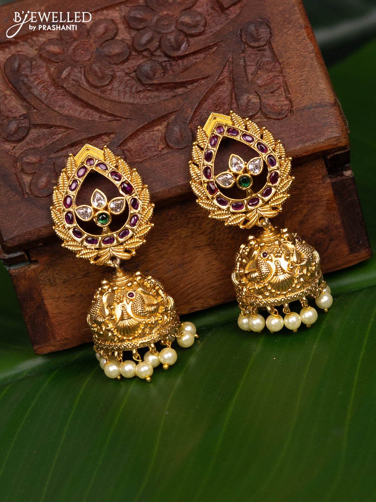 Antique jhumka peacock design with kemp & cz stones and pearl hangings