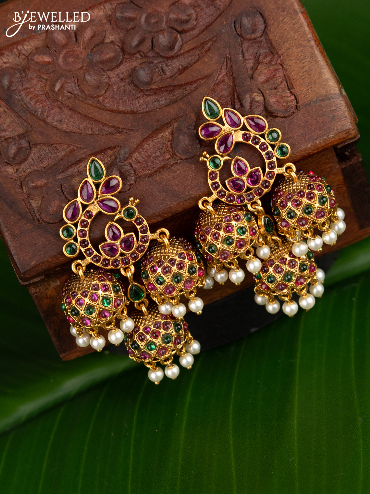 Antique jhumka peacock design with kemp stones and pearl hangings