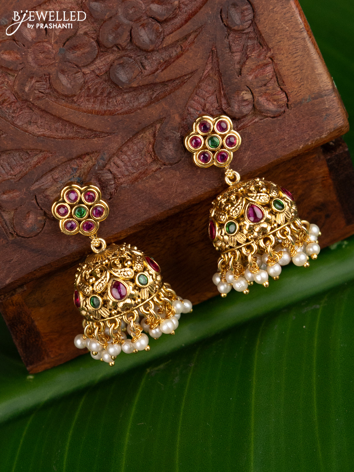 Antique jhumka peacock design with kemp stones and pearl hangings