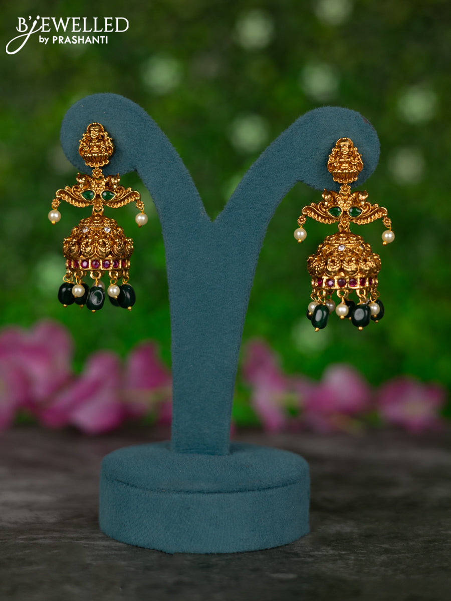 Antique jhumkas lakshmi design with kemp & cz stones and pearl & green beads hangings