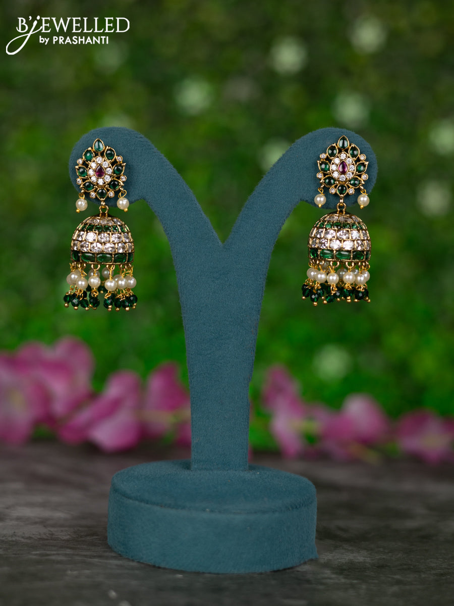 Antique jhumkas with kemp & cz stones and pearl & green beads hangings