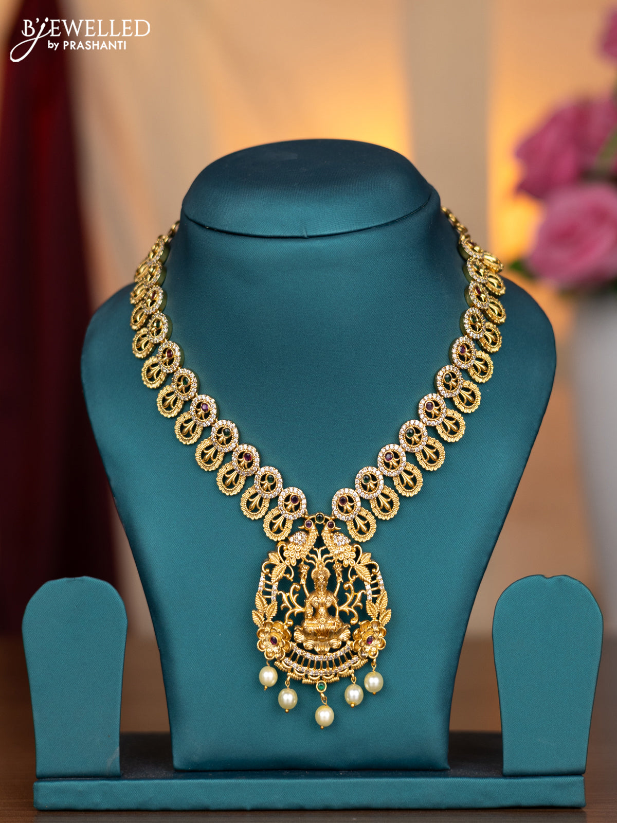 Antique necklace lakshmi design with kemp & cz stones and pearl hangings without earring