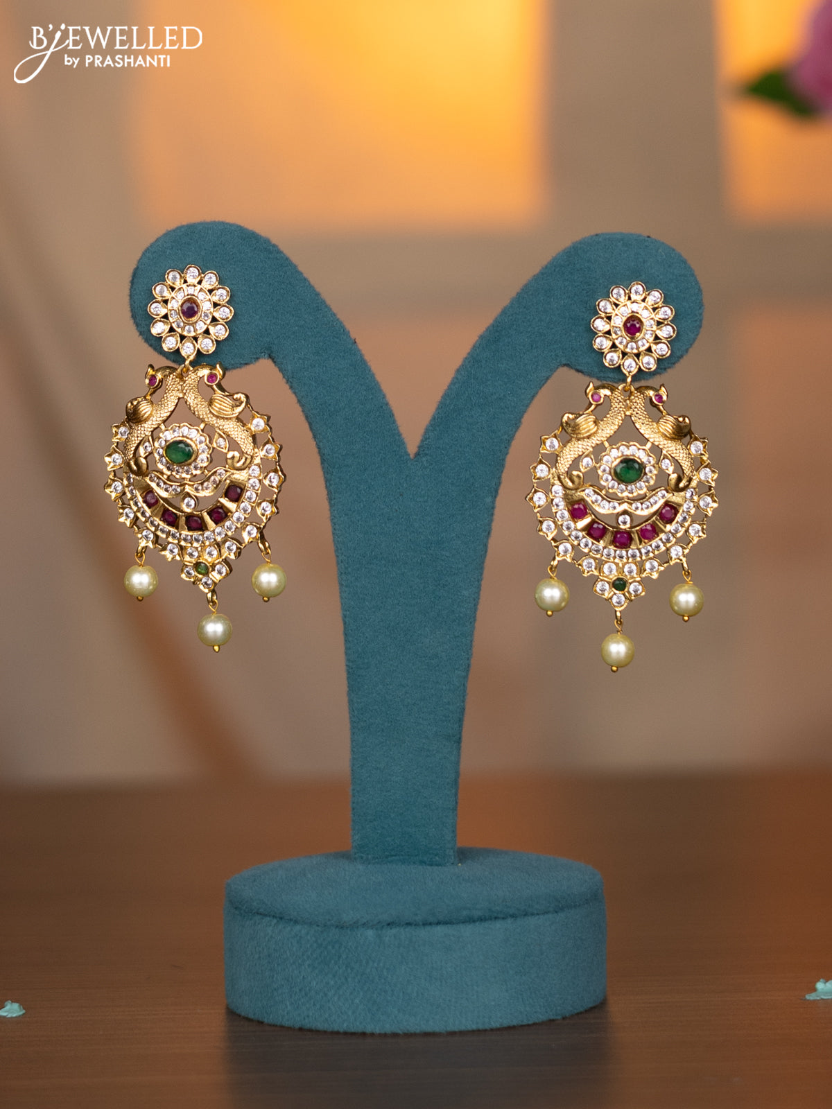 Antique Necklace peacock design with kemp & cz stones and pearl hangings