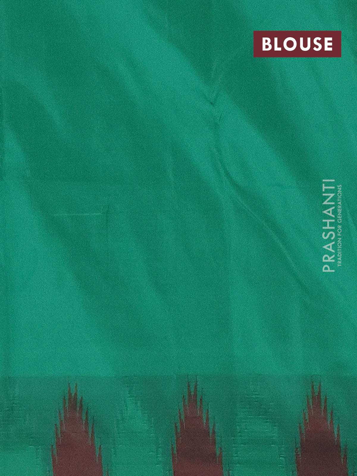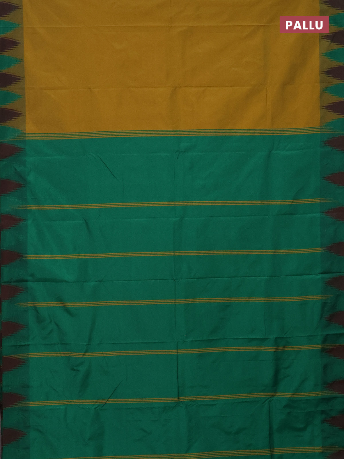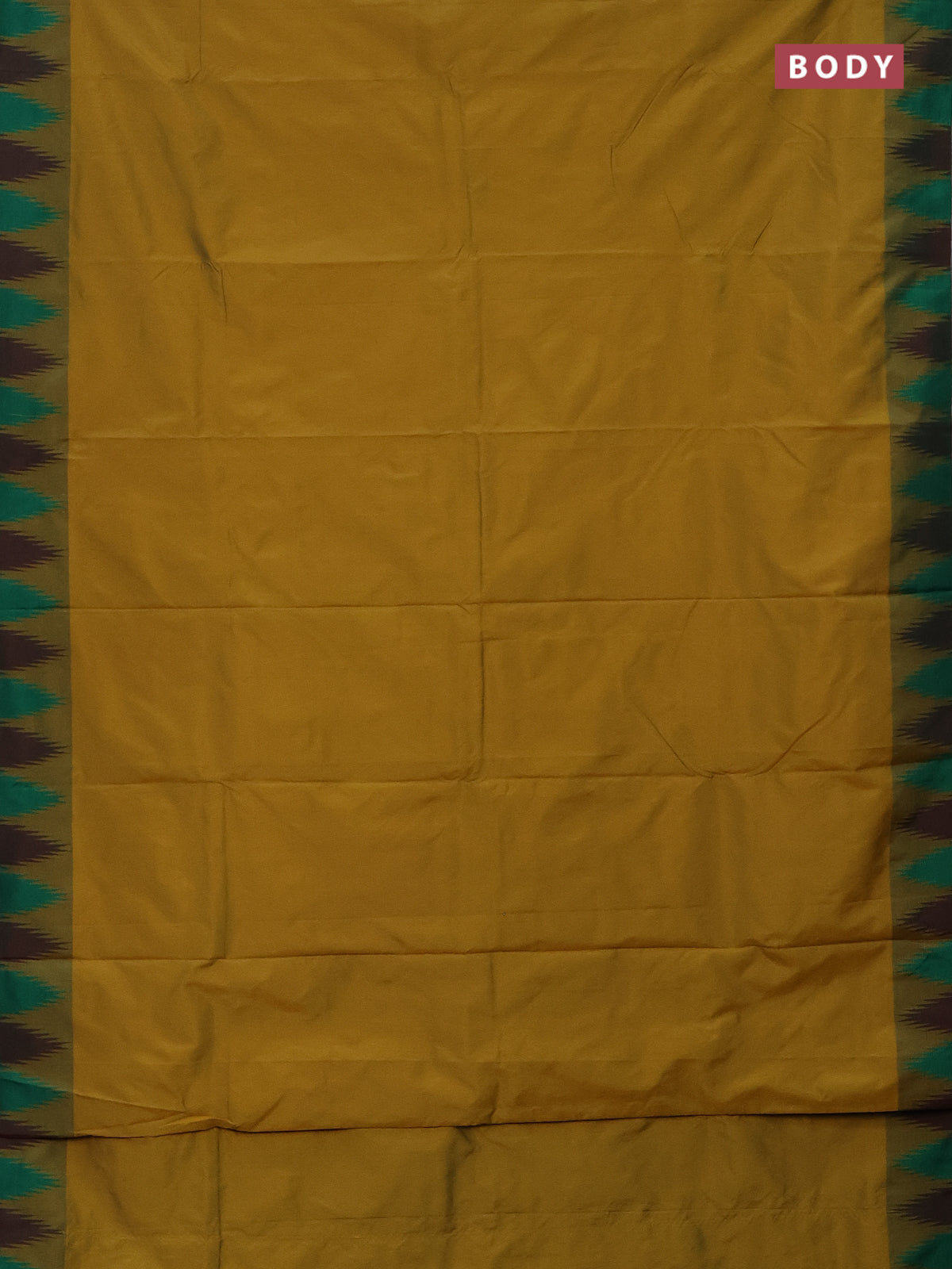 Arani semi silk saree dark mustard and dual shade of green with plain body and temple design border