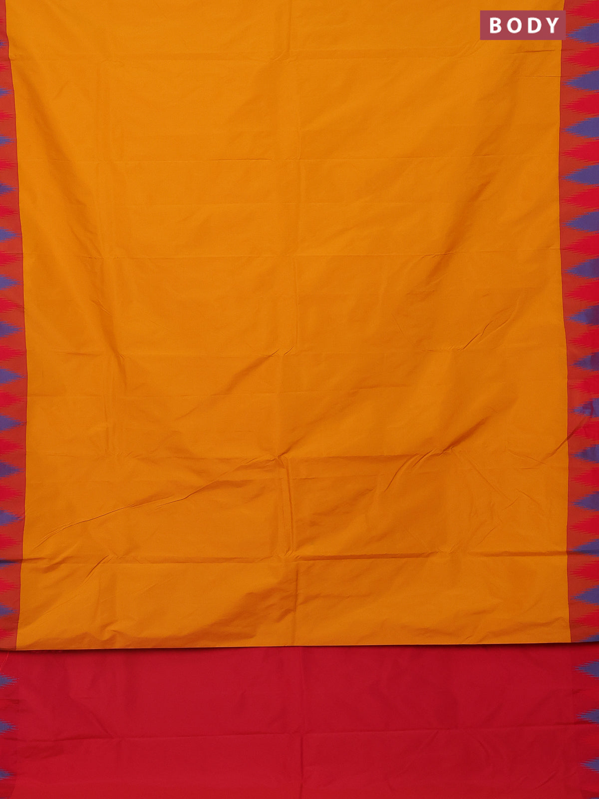 Arani semi silk saree mustard yellow and dual shade of red with plain body and temple design border