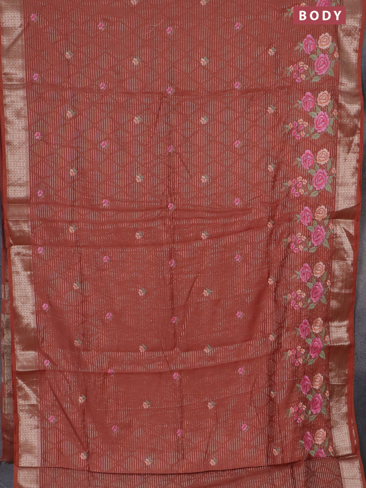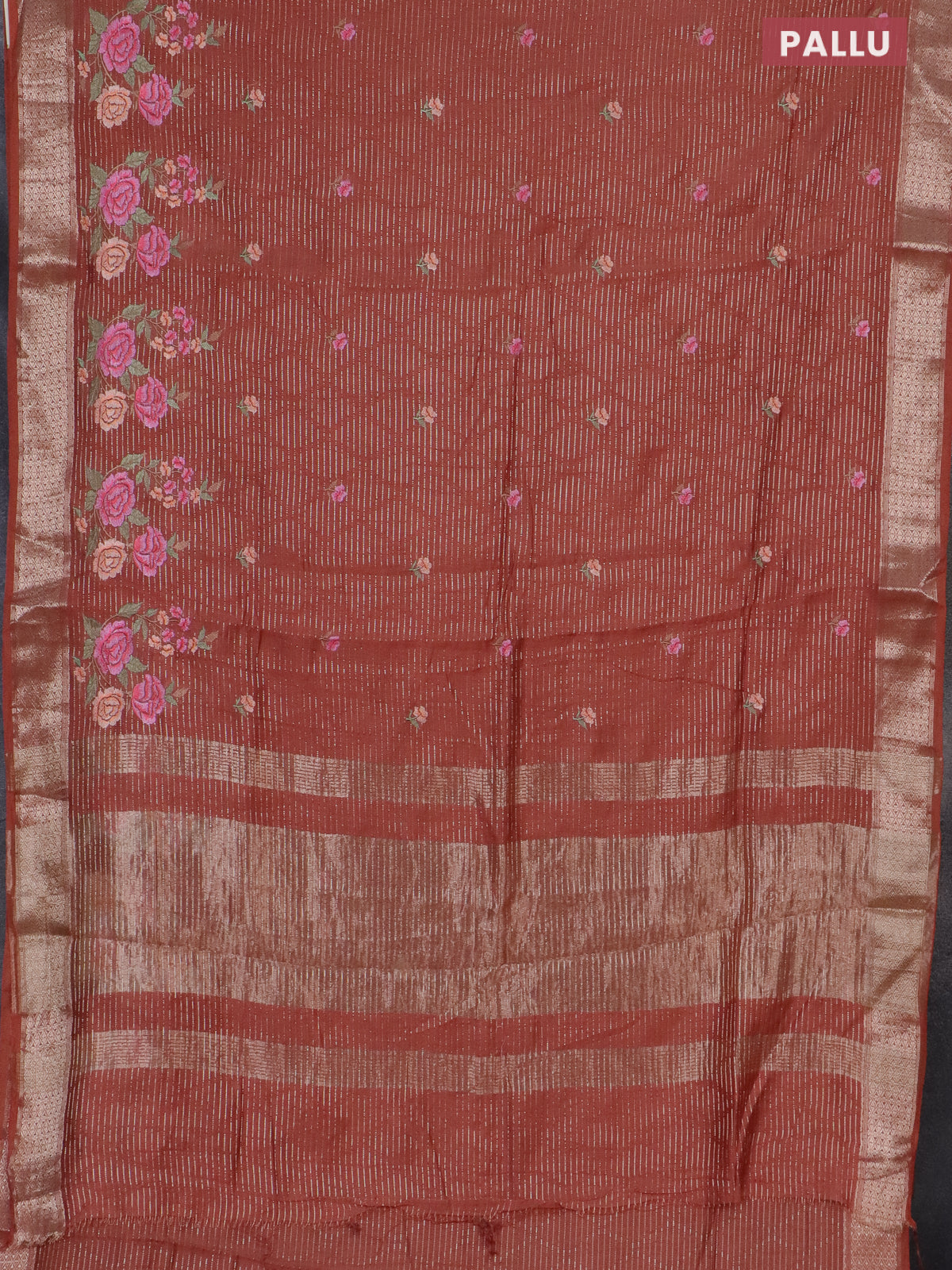 Assam silk saree rust shade with allover zari weaves & floral embroidery work buttas and zari woven border