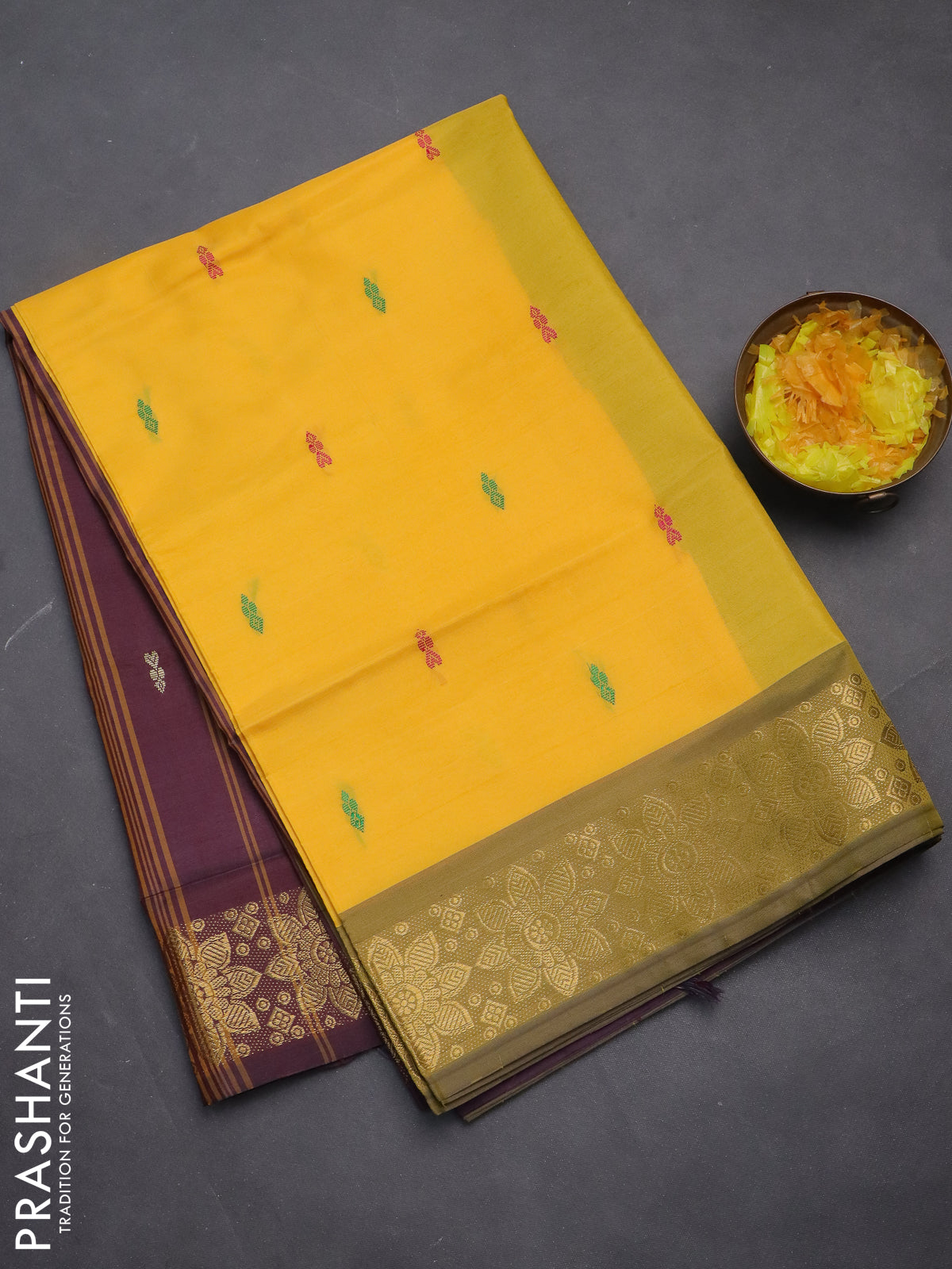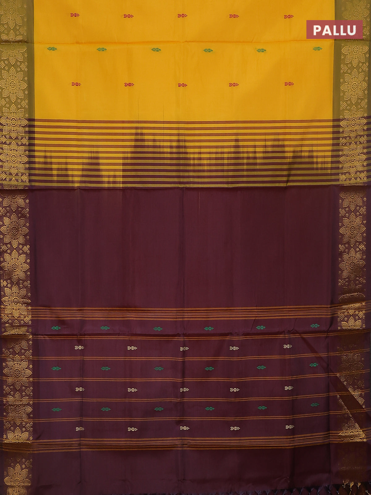 Banana pith saree yellow and deep maroon with thread woven buttas and zari woven border