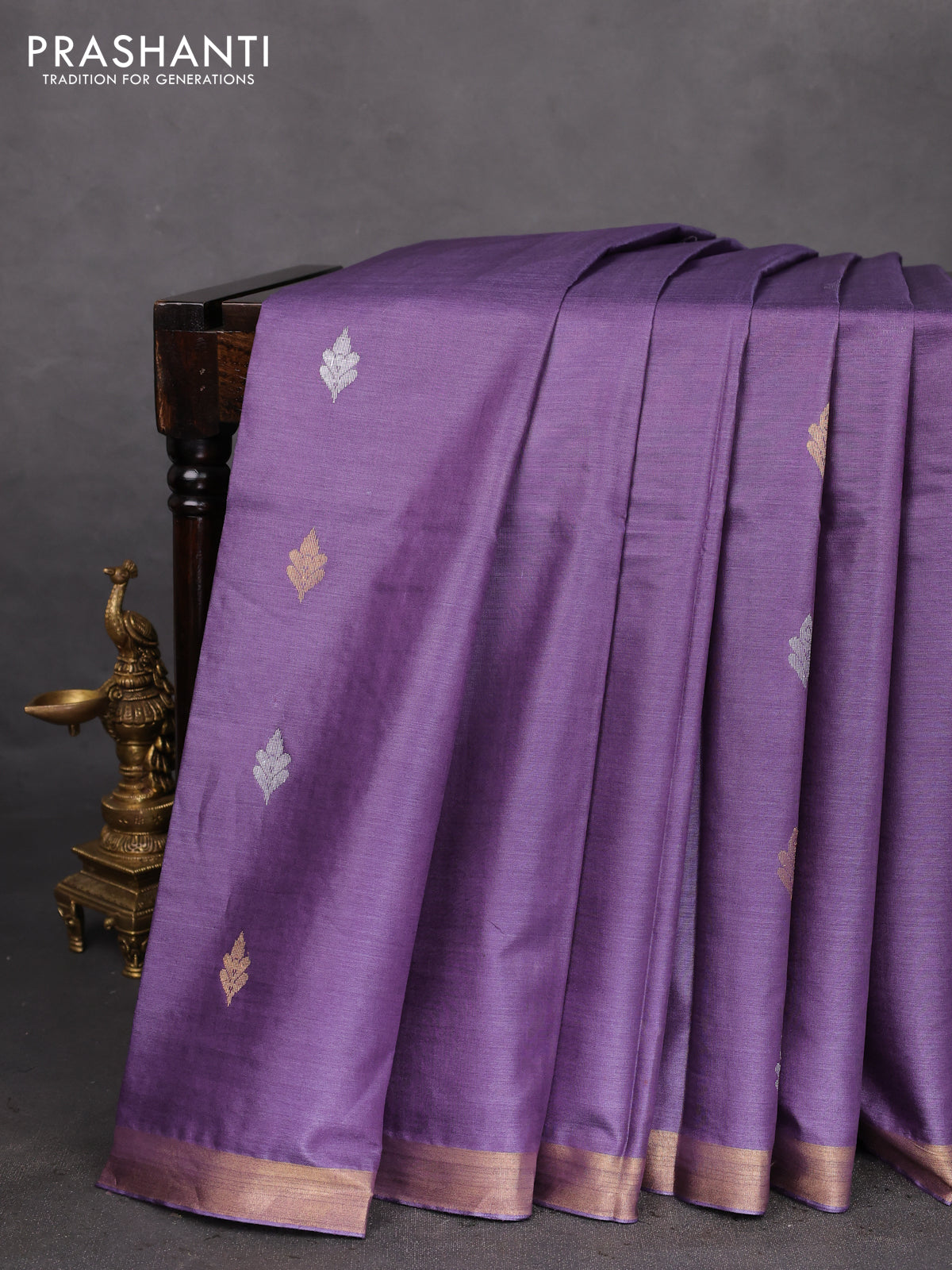 Banana silk saree violet with silver & gold zari woven buttas and zari woven border