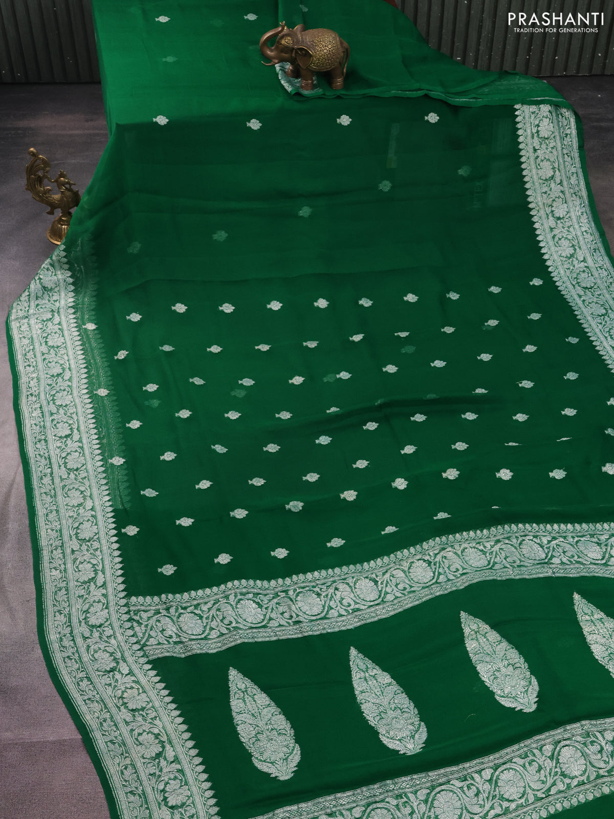 Banarasi chiffon silk saree green with silver zari woven buttas and silver zari woven border