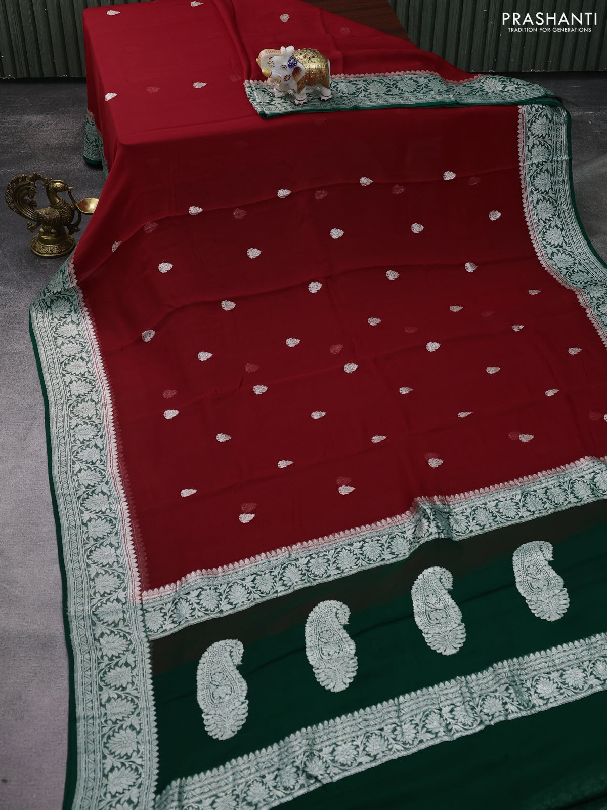 Banarasi chiffon silk saree kumkum red and dark green with silver zari woven buttas and silver zari woven floral border