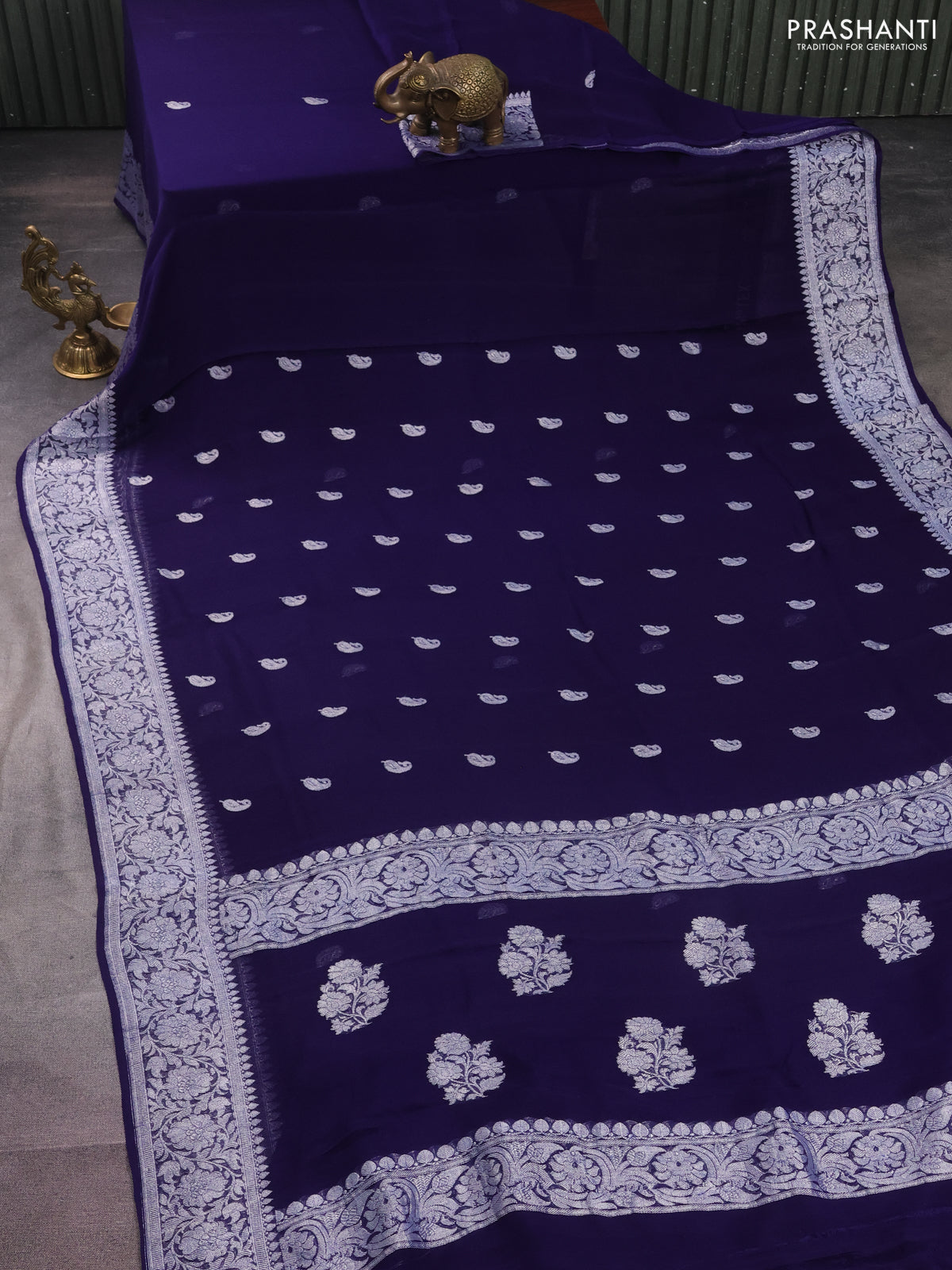 Banarasi chiffon silk saree navy blue with paisley silver zari woven buttas and floral silver zari woven border