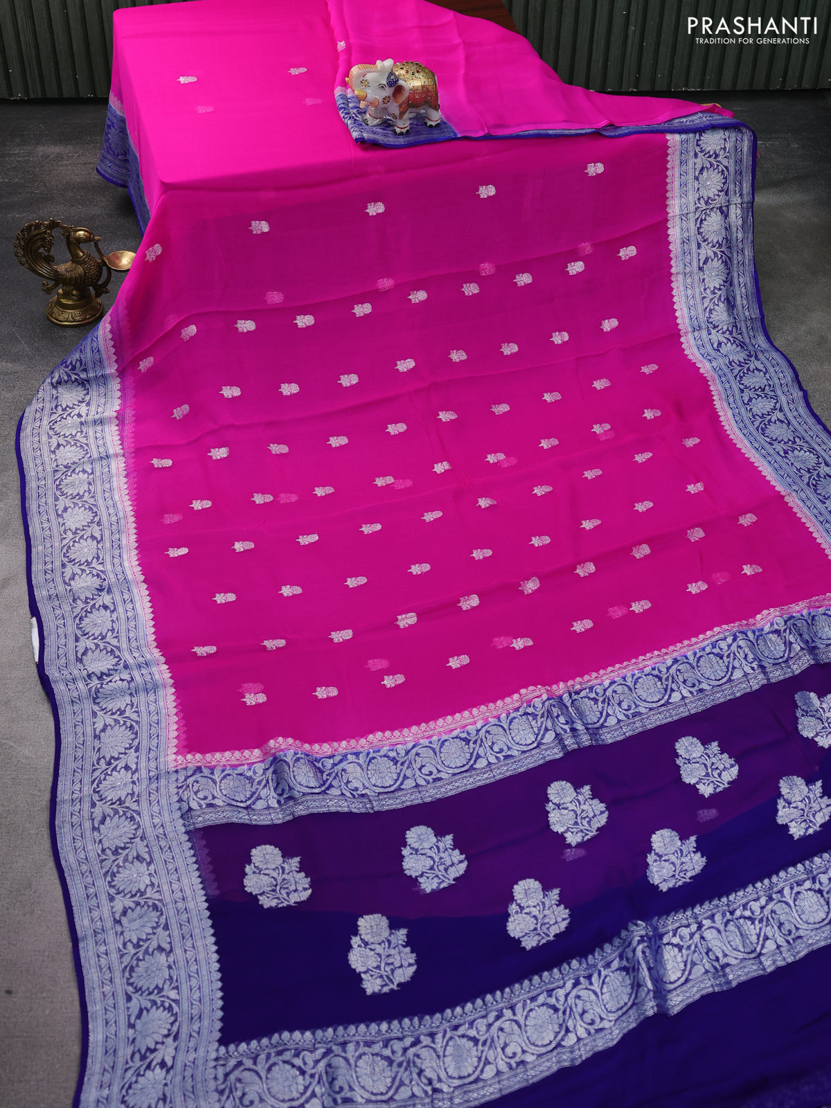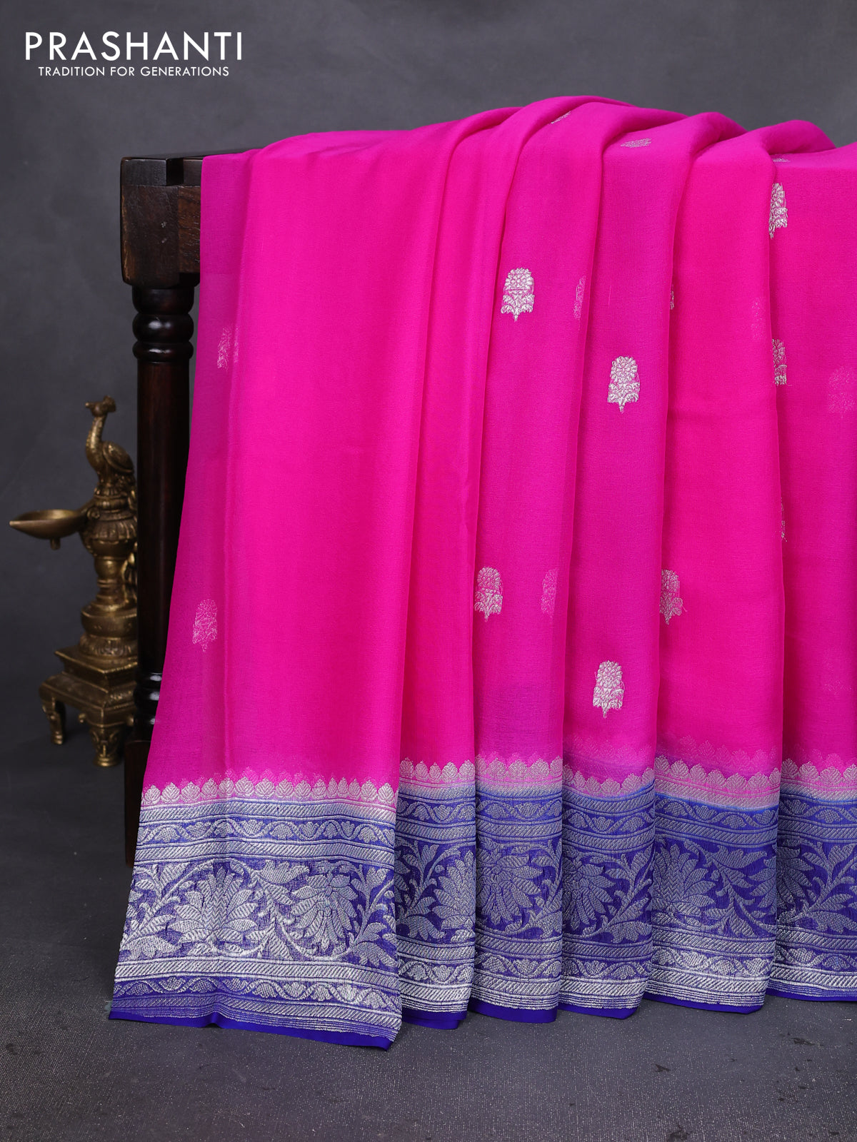 Banarasi chiffon silk saree pink and blue with silver zari woven buttas and silver zari woven floral border