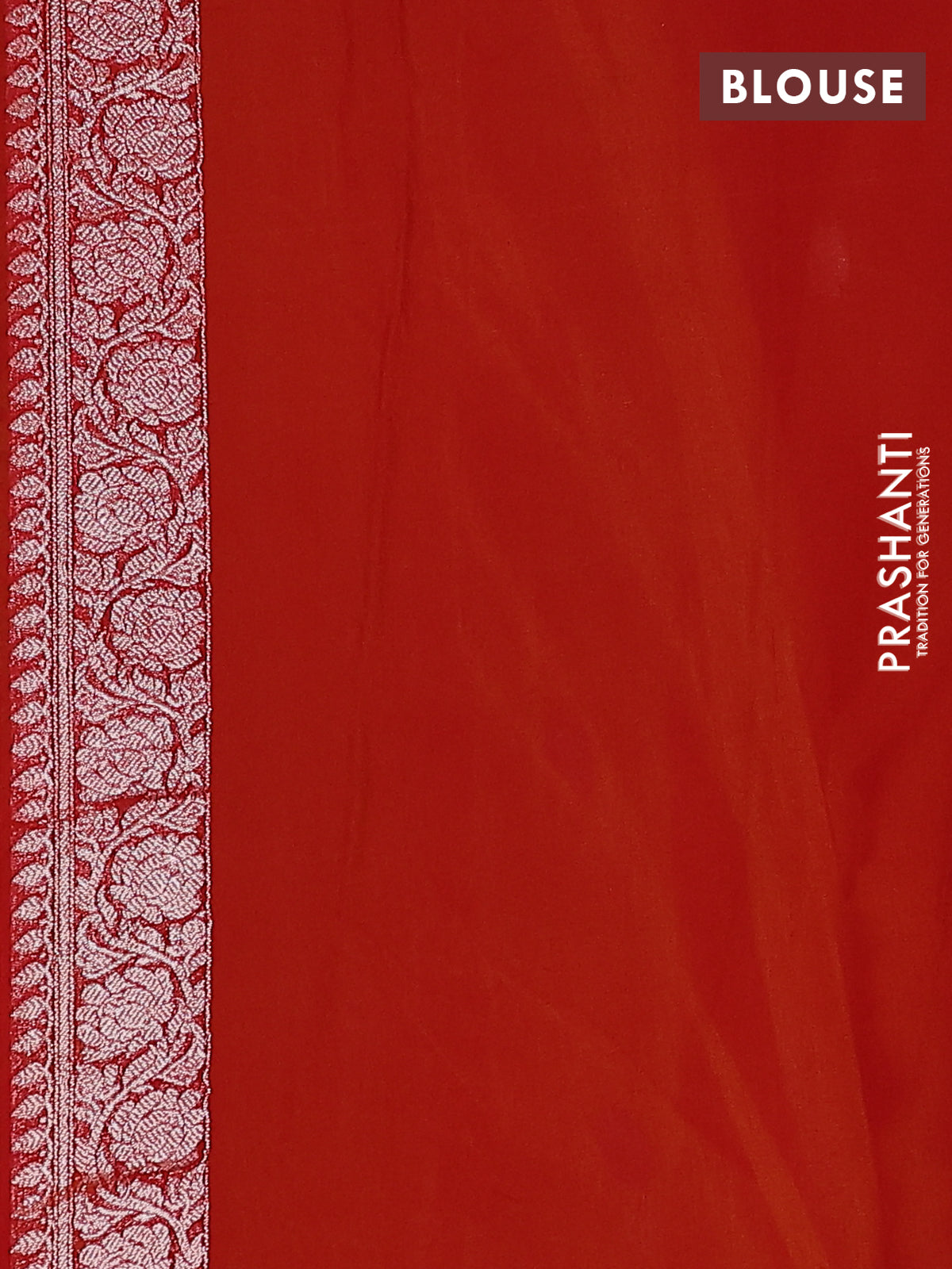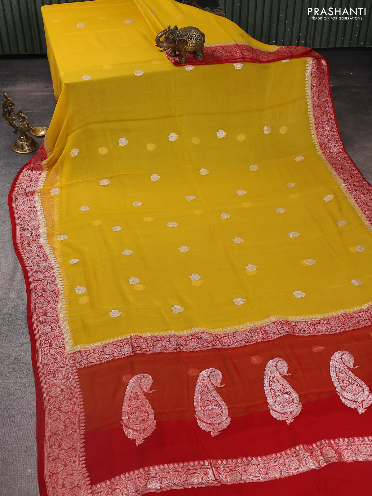 Banarasi chiffon silk saree yellow and red with silver zari woven buttas and silver zari woven floral border