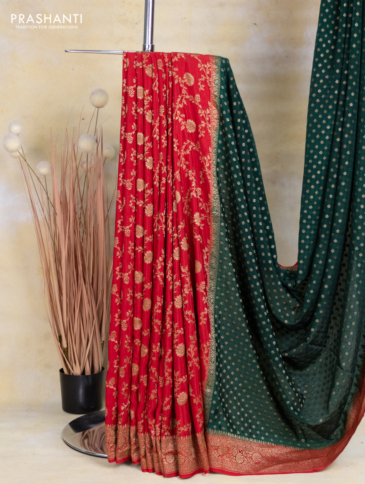 Banarasi crepe partly saree bottle green and red with allover thread & zari woven butta weaves and woven border