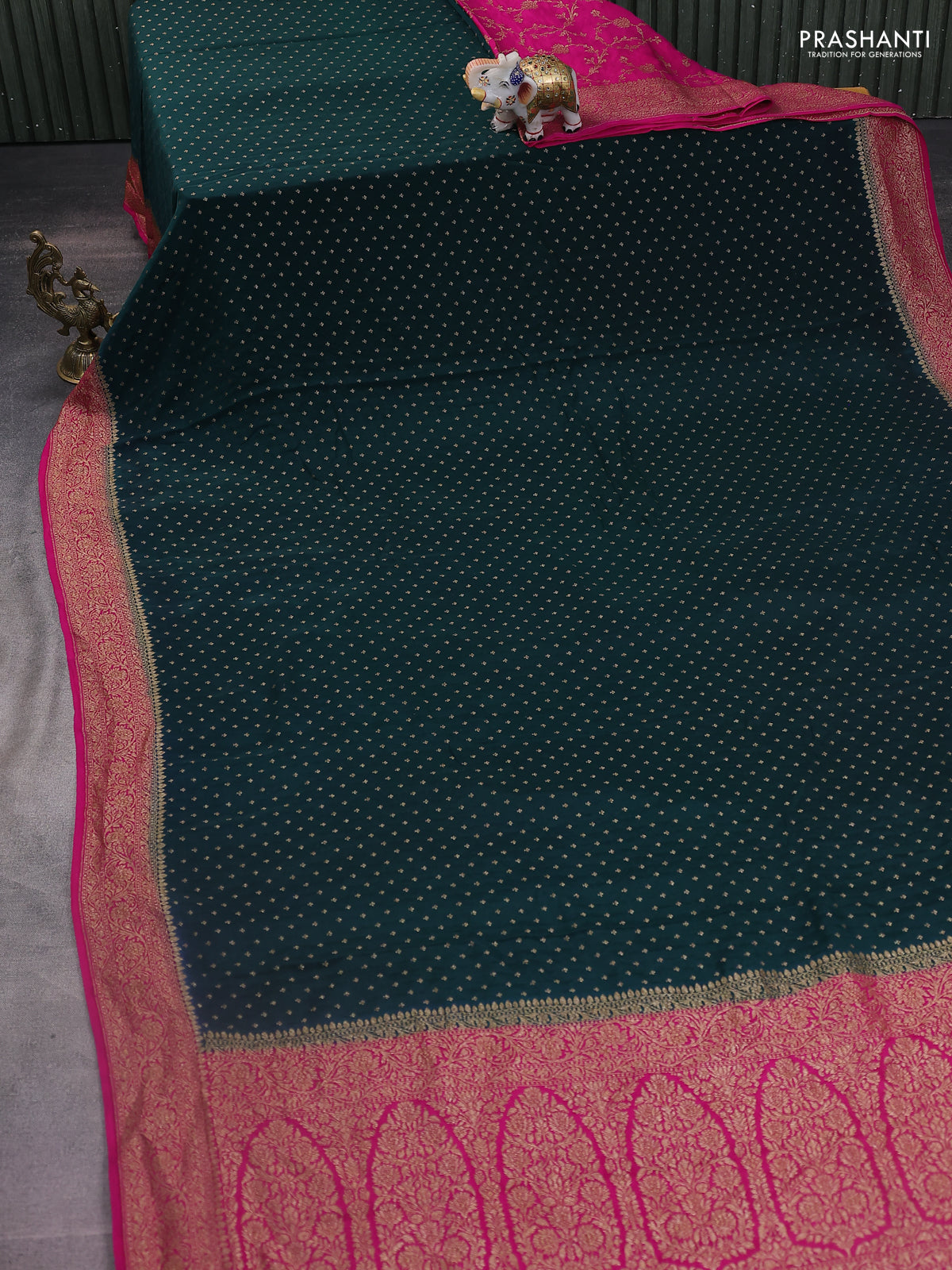 Banarasi crepe partly saree green and pink with woven buttas and woven border