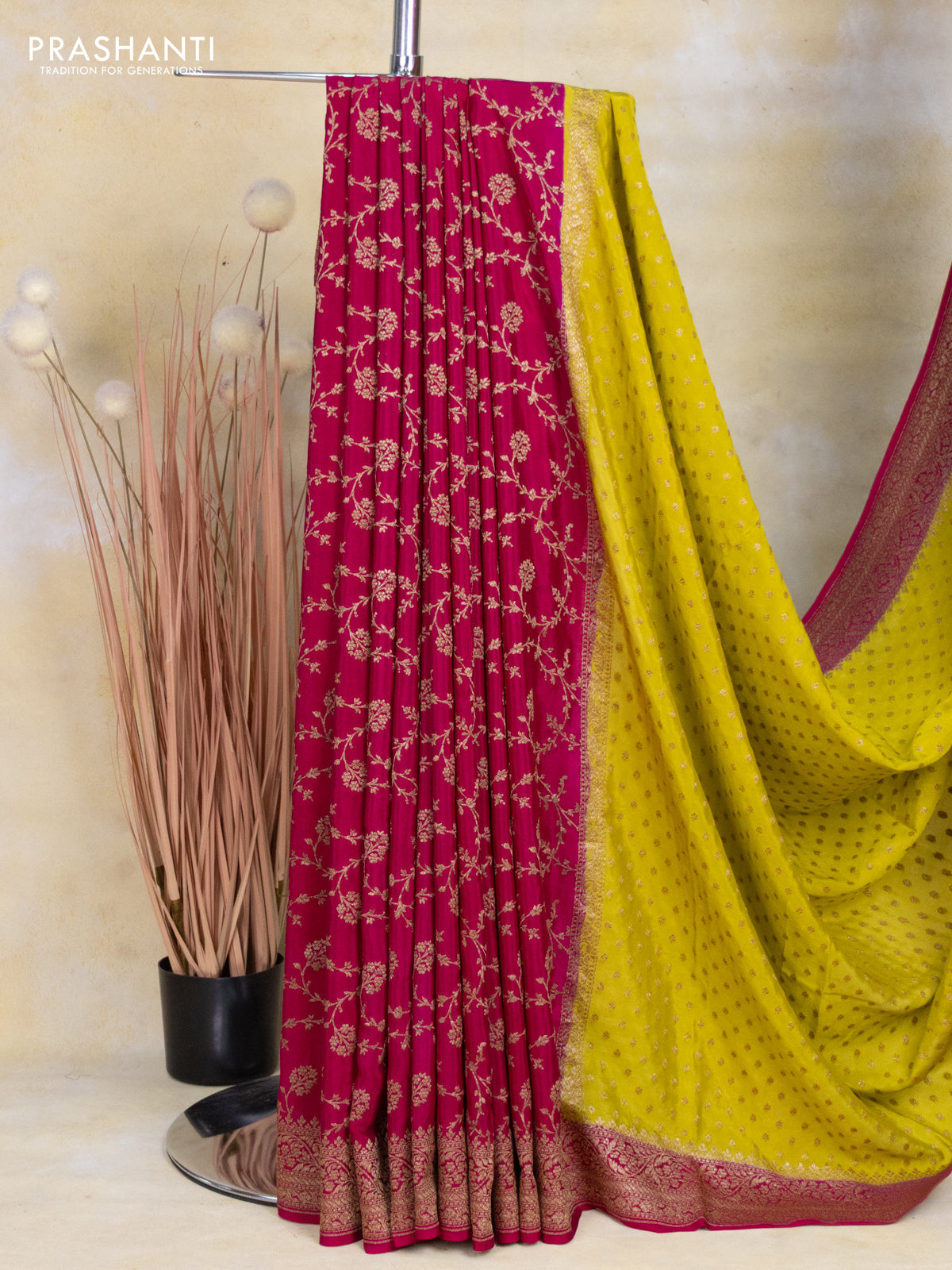 Banarasi crepe partly saree lime green and pink with allover thread & zari woven butta weaves and woven border