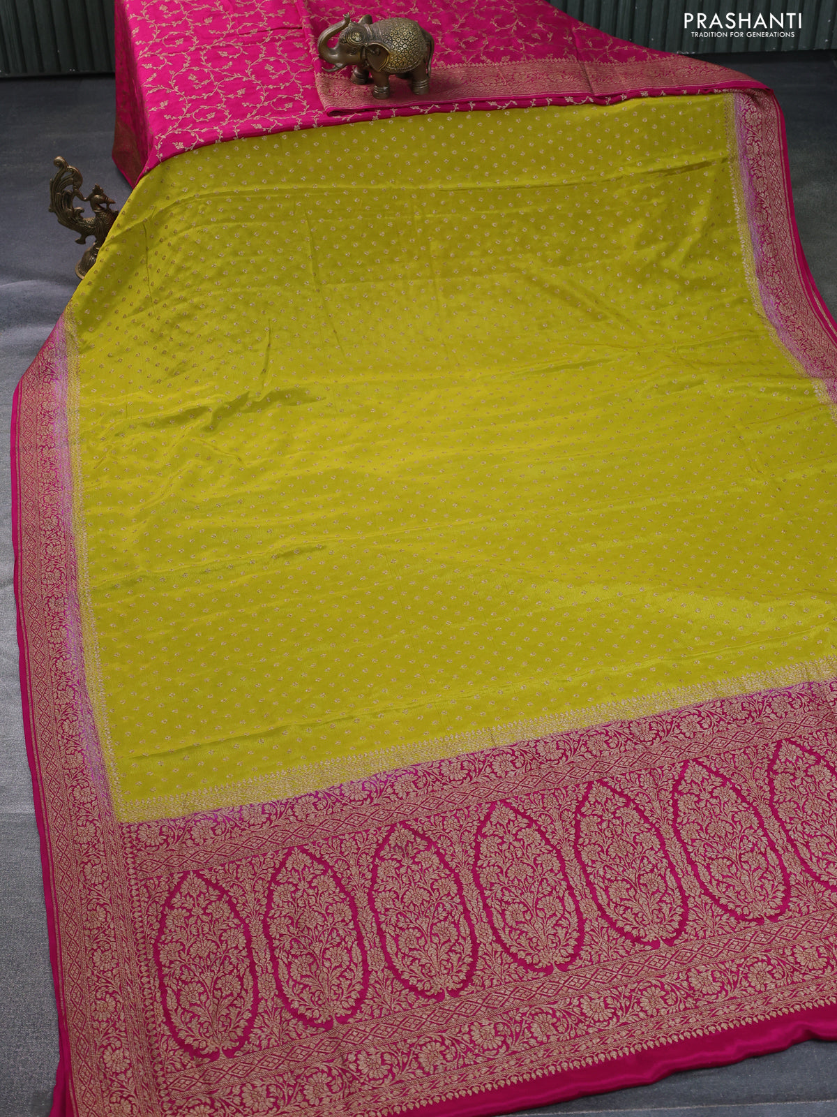Banarasi crepe partly saree lime yellow and pink with allover thread & zari woven butta weaves and woven border