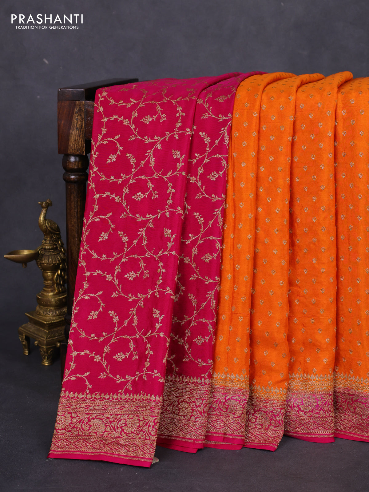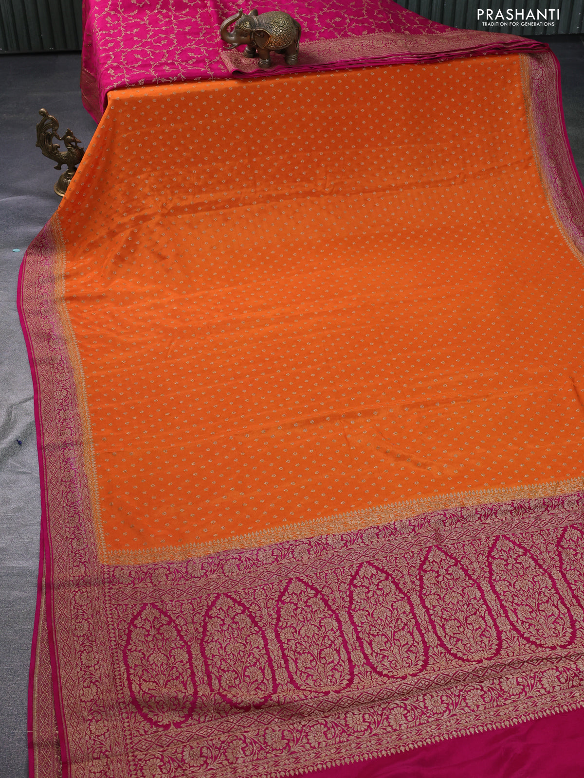 Banarasi crepe partly saree orange and pink with allover thread & zari woven butta weaves and woven border