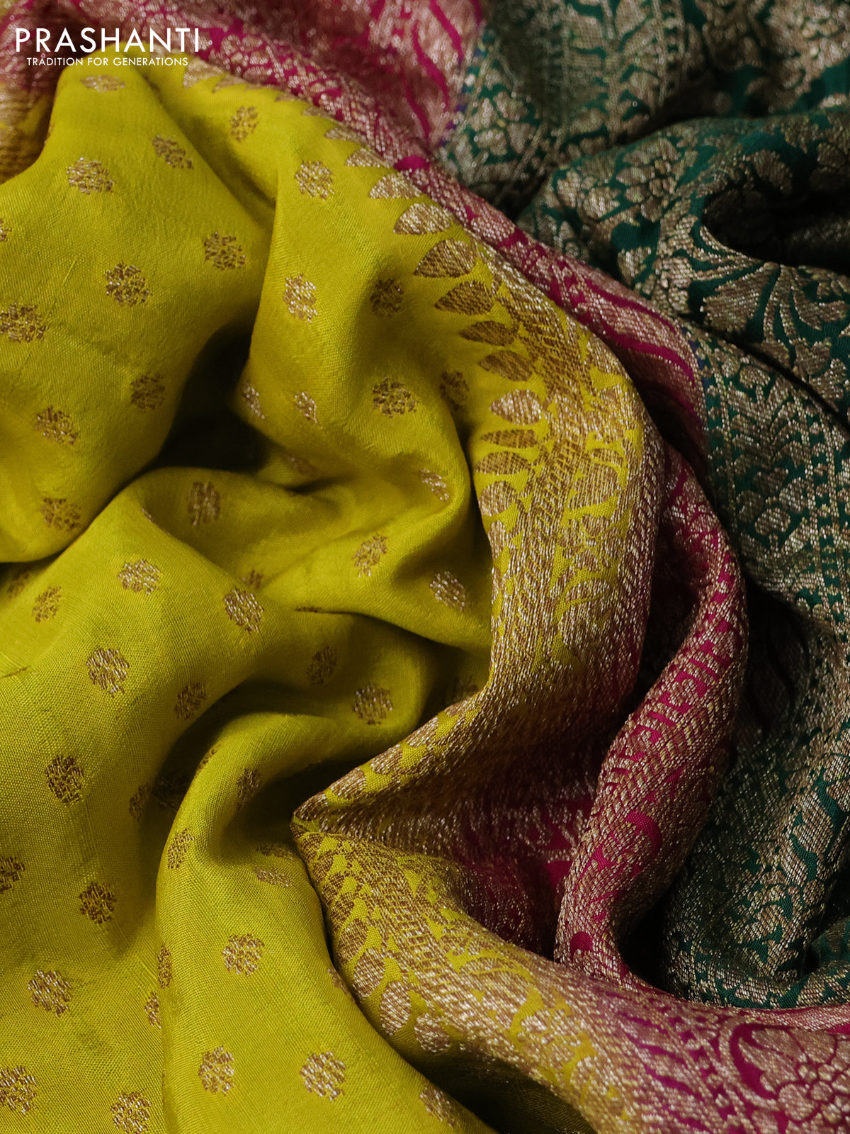 Banarasi crepe saree lime yellow and pink green with allover thread & zari butta weaves and woven border