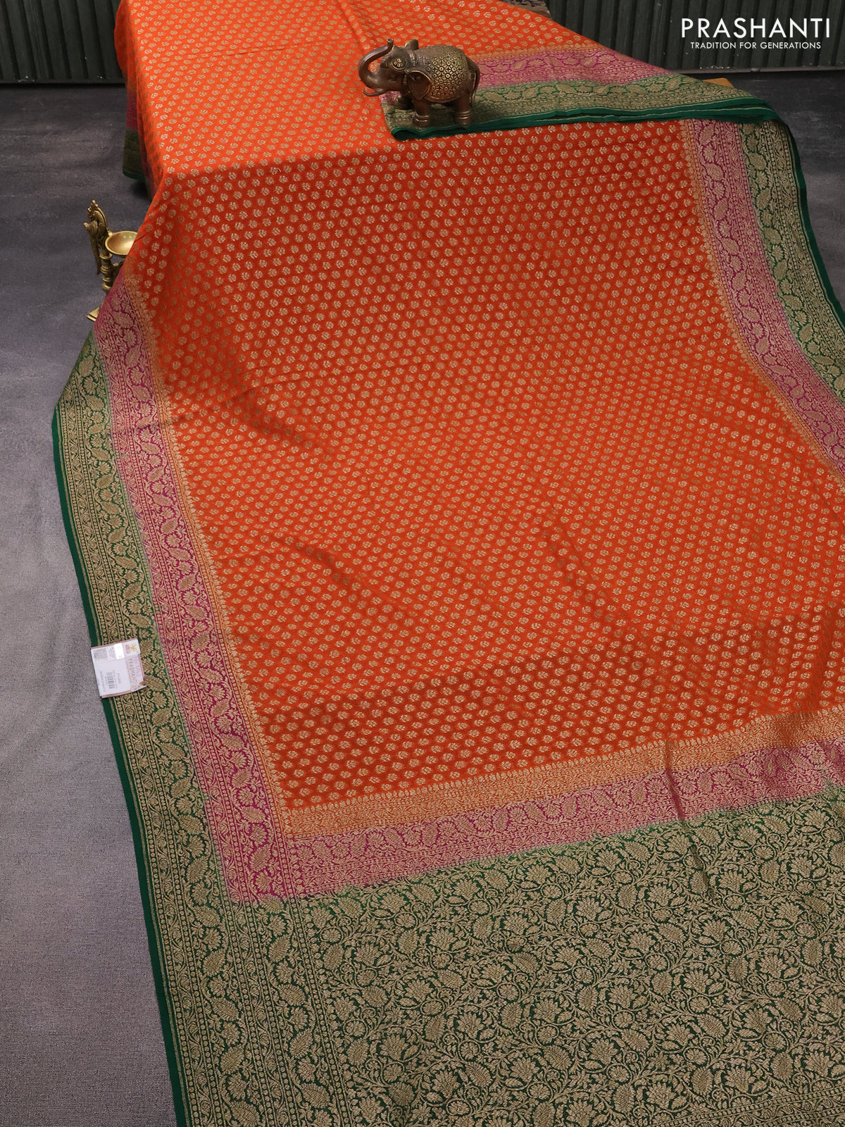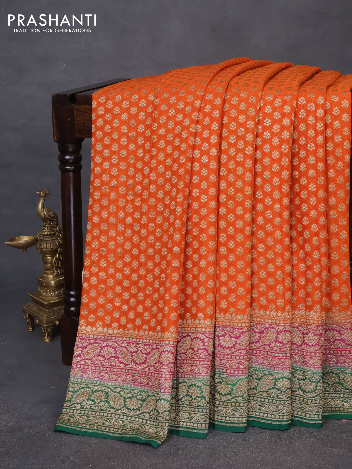 Banarasi georgette saree orange and pink green with allover thread & zari butta weaves and woven border