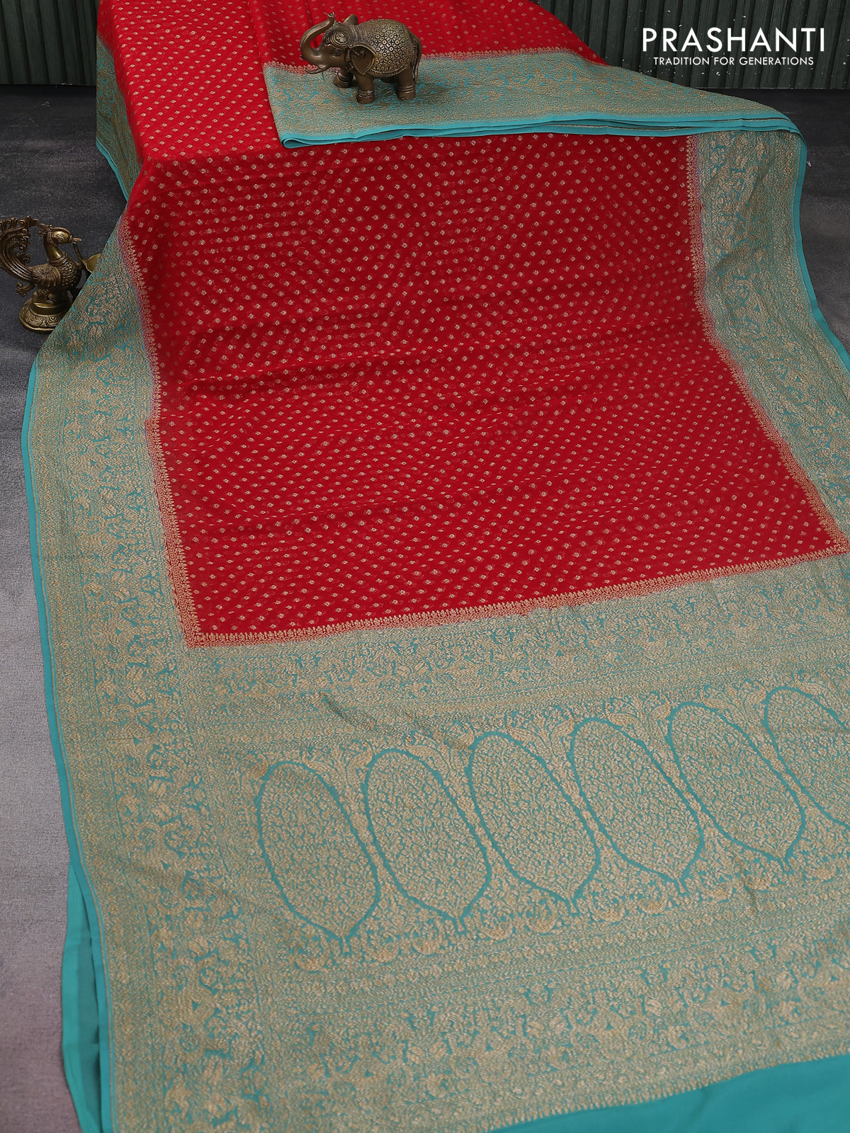 Banarasi georgette saree red and teal blue with allover thread & zari woven butta weaves and woven border