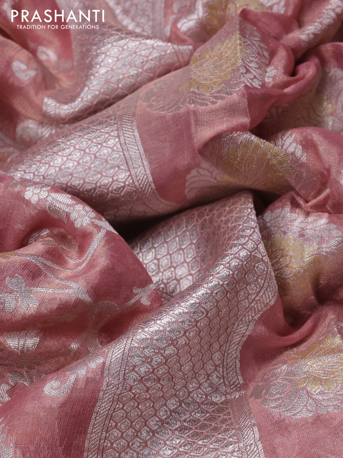 Banarasi georgette tissue saree peach shade with allover thread & silver zari floral weaves and silver woven border