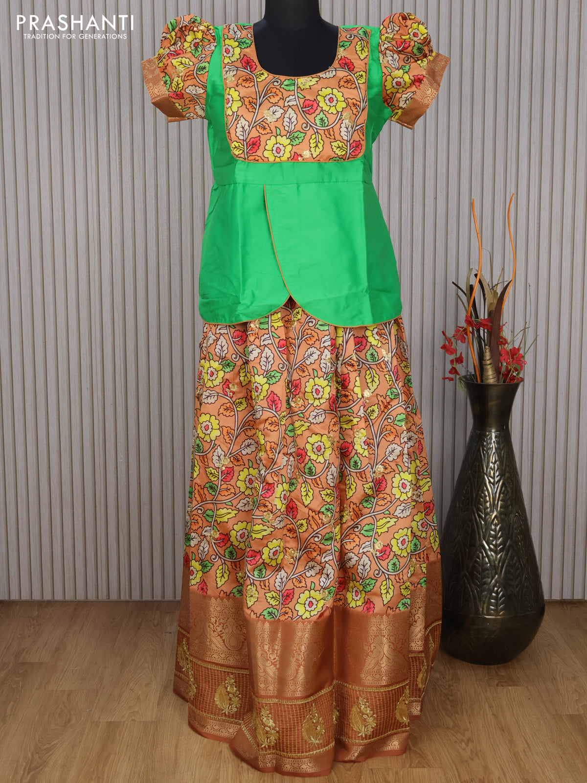 Banarasi kids lehenga green and orange shade with patch work neck pattern and kalamkari prints embroidery work & zari woven sequin work border for 16 years