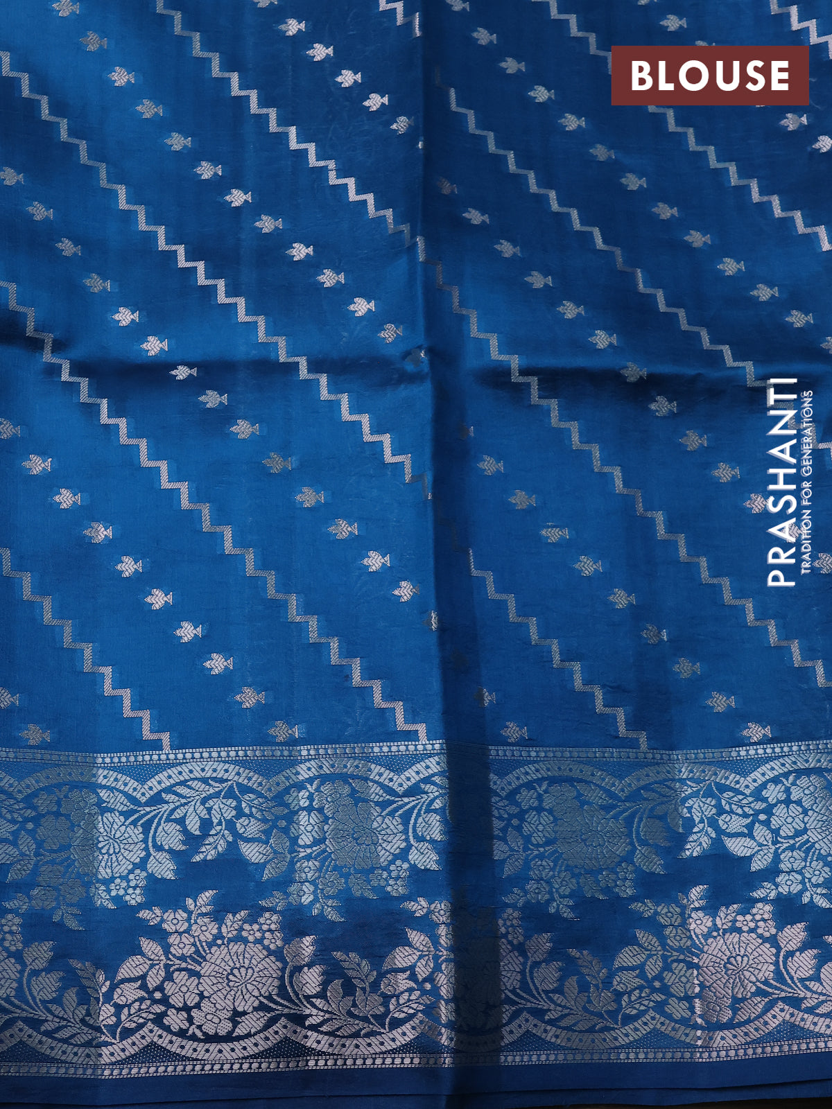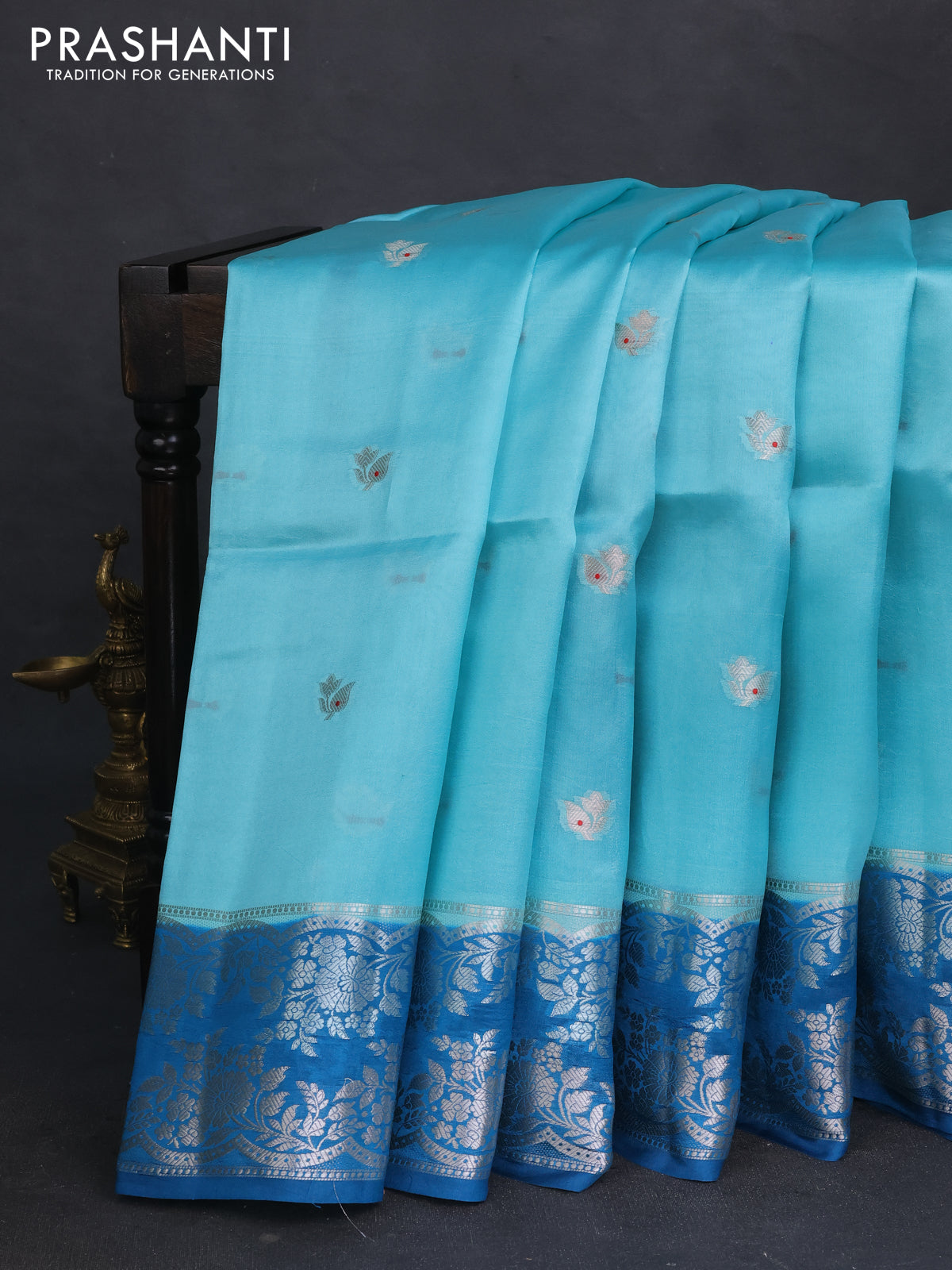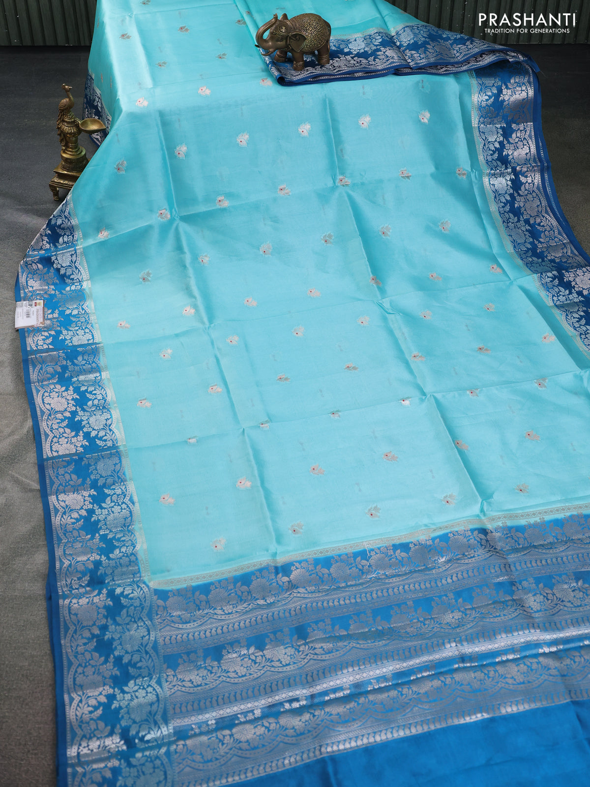 Banarasi poona silk saree teal blue and cs blue zari woven floral buttas and silver zari woven border