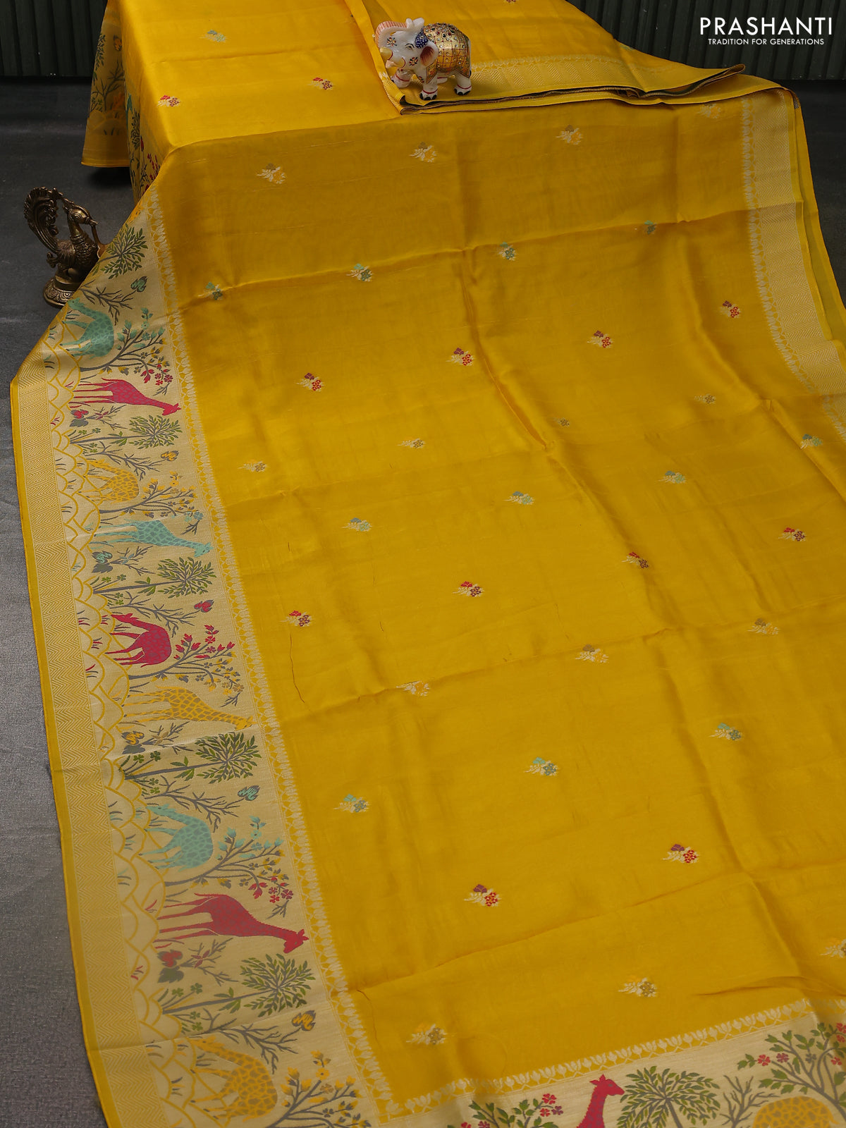 Banarasi semi raw silk saree mustard yellow with thread & silver zari buttas and long zari woven paithani style border