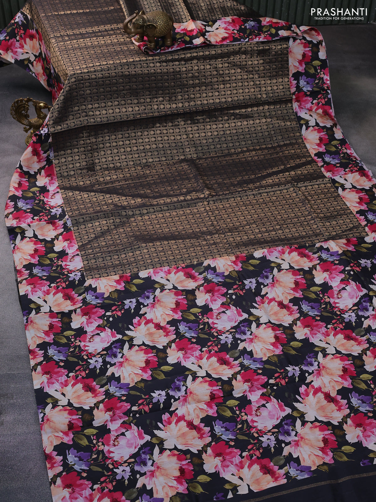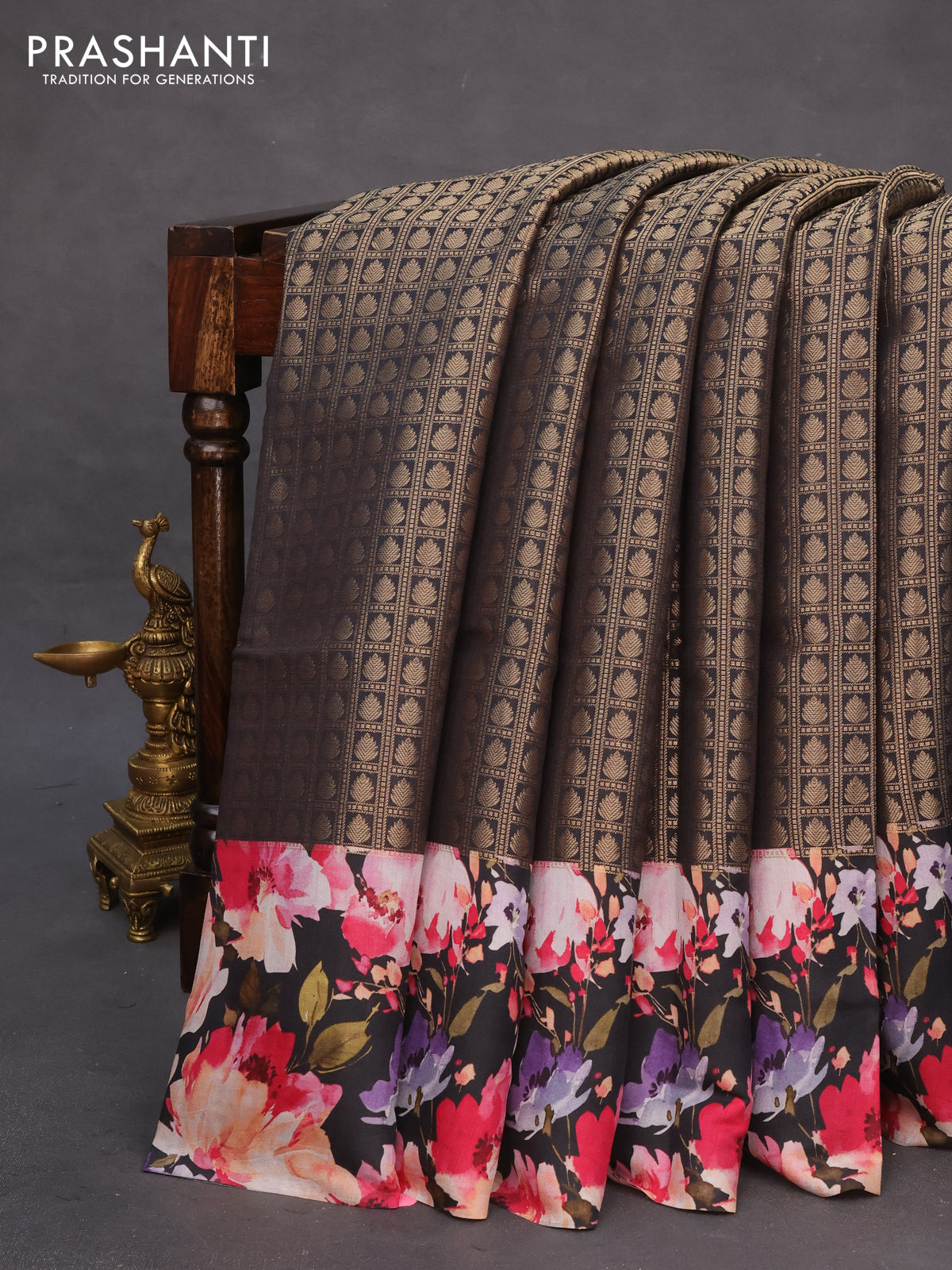 Banarasi silk saree black with allover zari woven brocade weaves and floral digital printed border